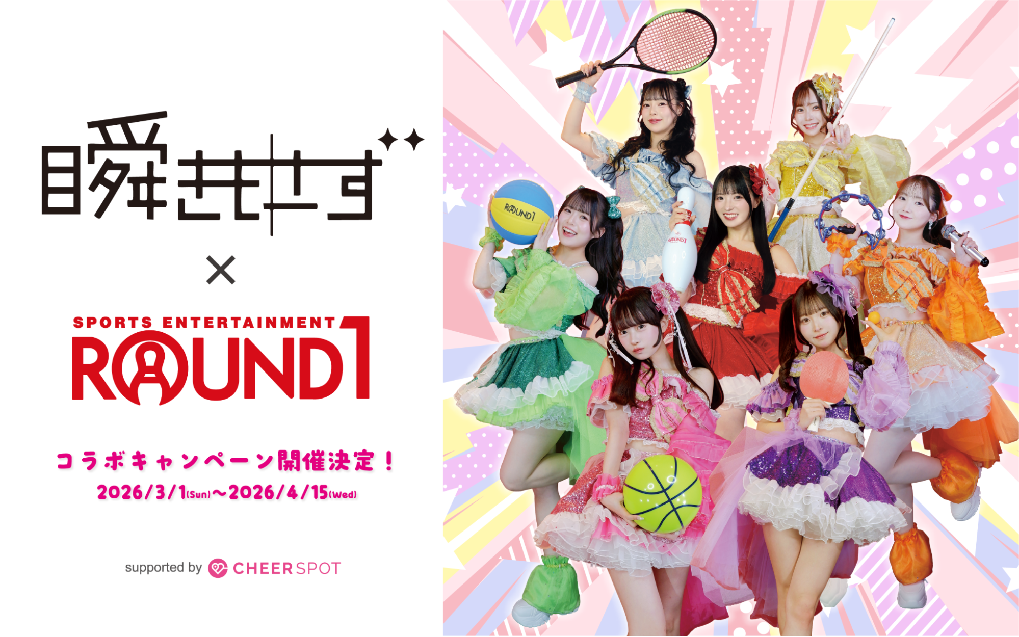【概要】CheerSPOTユーザーによる、アイドルグループ「瞬きもせず」へのアプリ内応援(Cheer)の累計数に応じて、ラウンドワン店舗内でのイベント開催企画を展開いたします。(※1)