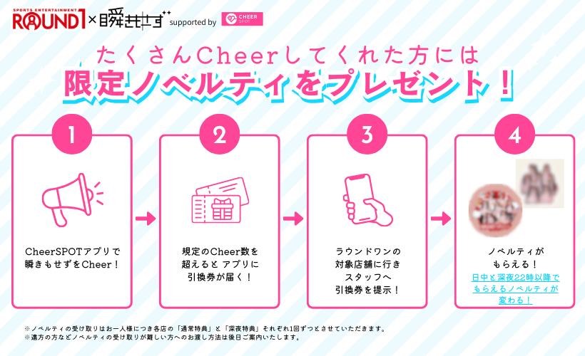 【来店特典】Cheer(応援)数に応じて「CheerSPOT × 瞬きもせず × ラウンドワン」オリジナル来店特典をご用意しております。通常時間帯(OPEN~21:59)の特典に加え、深夜帯(22:00~CLOSE)来店促進を目的として、通常特典とは異なる深夜限定デザインのアイテムも展開いたします。