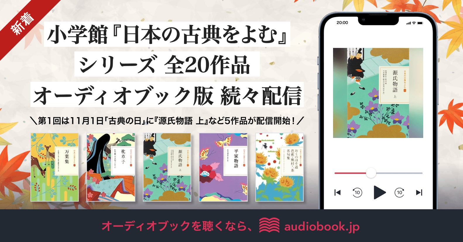 オーディオブック書籍ラインナップ数No.1(※1)の「audiobook.jp」を運営する株式会社オトバンク(本社:東京都文京区、代表取締役社長:久保田裕也、以下「オトバンク」)は、11月1日「古典の日」から、小学館『日本の古典をよむ』シリーズ(全20作品)のオーディオブックを順次配信いたします。第1回配信は、『源氏物語 上』『枕草子』『万葉集』『平家物語』『おくのほそ道 芭蕉・蕪村・一茶名句集』の5作品。本作品の朗読には、アナウンサーの平野啓子さん、葛西聖司さん、野間脩平さんなど、文学作品の朗読に熟達した実力者が参加しています。日本語の美しい響きにふれながら古典の魅力を再発見できる作品です。