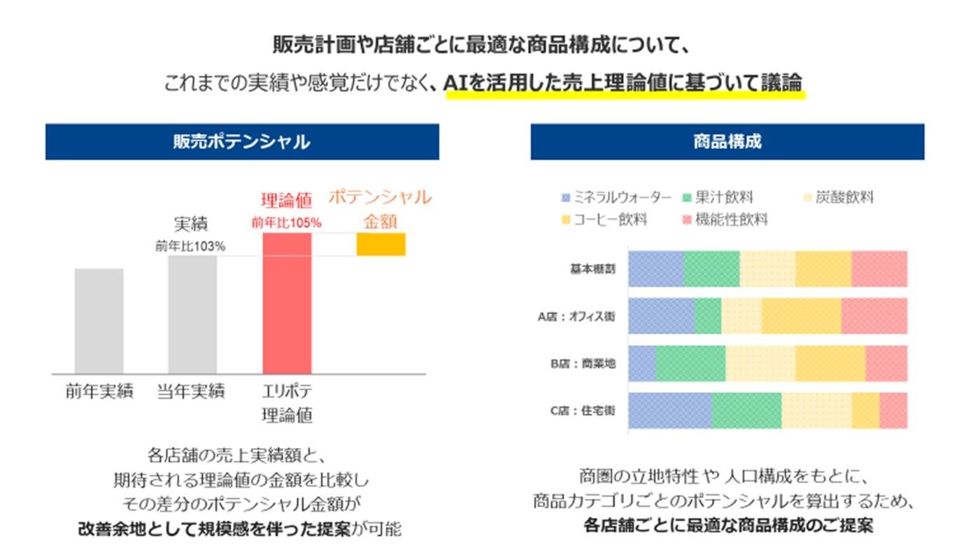 アサヒ飲料株式会社(本社 東京、社長 米女 太一)は、株式会社インテージ(本社 東京、社長:檜垣 歩、以下インテージ)が開発した「エリアポテンシャル・サーチ」を活用した売り場提案の強化を食品業界に先駆けて開始します。「エリアポテンシャル・サーチ」では、店舗や商圏の特長や人口動態の変化をAIによって解析し、スーパーなどの店舗ごとに期待される販売金額を推計することができ、最適な商品構成や販売計画の策定を支援することが可能になります。尚、「エリアポテンシャル・サーチ」の活用は食品業界で初めてとなります。