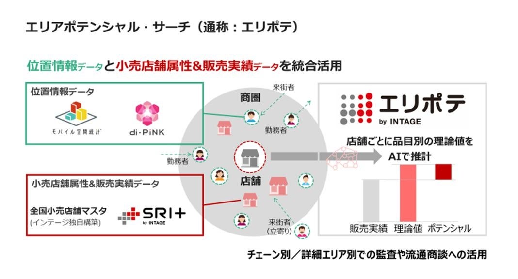 そのような現状に対応するため、「エリアポテンシャル・サーチ」ではインテージが提供する全国の消費財の販売動向を分析するデータベースである「SRI+®」と、NTTドコモが提供する全国の人口動態をリアルタイムに分析できる「モバイル空間統計®」や「di-PiNK®」で保有するドコモの会員情報を組み合わせてAIで解析することで、全国のスーパーマーケットやドラッグストアの店舗ごとの、商品カテゴリー別の販売が期待される”理論値”を算出することを実現しました。