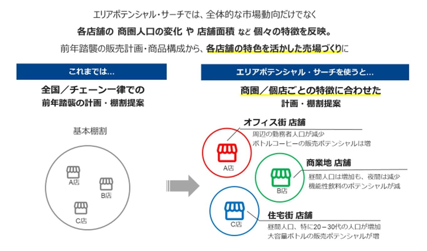 今回、変化する小売業の店舗戦略に対応するため、「エリアポテンシャル・サーチ」を活用し、従来の業態別や都道府県別での市場分析に加え、各店舗の立地や商圏に住んでいるお客様の特徴で商圏分析が可能になります。今後、各店舗の商圏に沿ったカテゴリー構成比での棚割りや、販促企画・販売目標値の提案を行ってまいります。