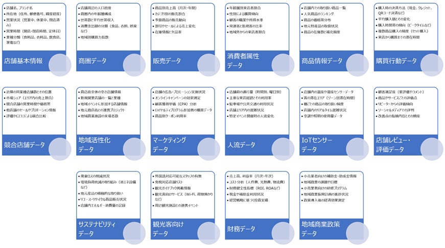 小売業界においてオープンデータの活用は、業界全体の効率化や顧客体験の向上において重要な役割を果たしています。特に、地域経済の活性化やデジタル変革の推進において、データの有効活用は新たなビジネスチャンスを生み出し、小売店舗の競争力を向上させるカギとなっています。ここでは、小売店舗分野におけるオープンデータの具体的な内容について分野ごとに分類しデータ内容を理解し、適切に活用することで、業務改善やマーケティング戦略の最適化、地域住民や観光客へのサービス強化につなげることができます。