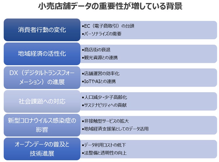 小売店舗データは、店舗が立地する地域の特性に密接に関連しているため、地域別に内容やフォーカスが大きく異なる。