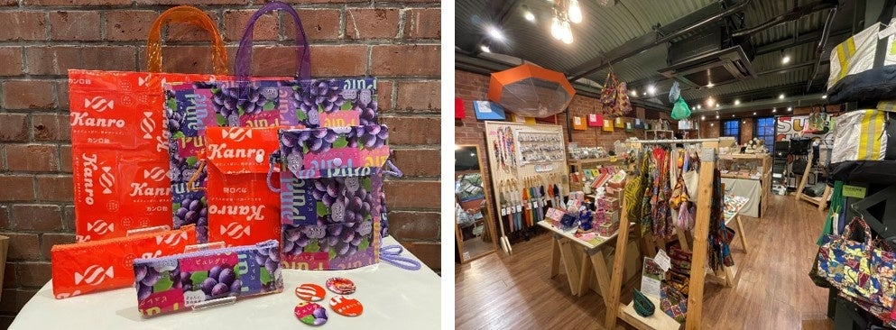 左:カンロのアップサイクル雑貨(バッグ、サコッシュ、ペンケース、缶バッジ) 右:「Sustainable Think.」店舗
