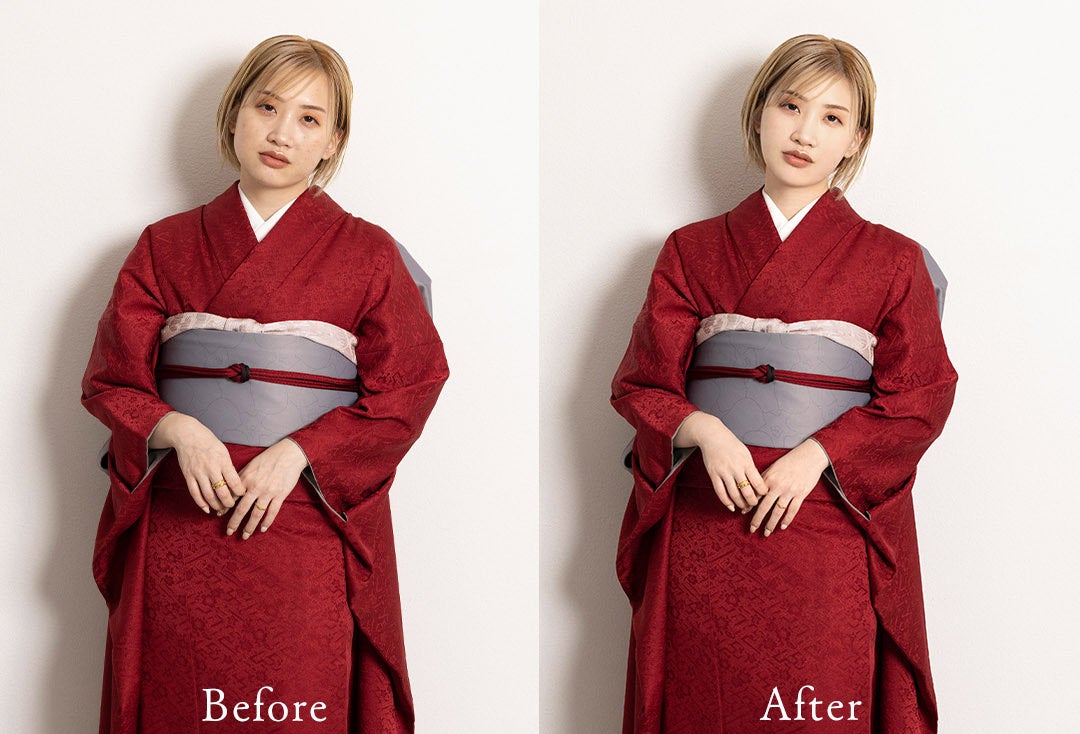 着付けにより体に膨らみが出る部分など、ドレスとは違った目線でレタッチをさせていただきます。