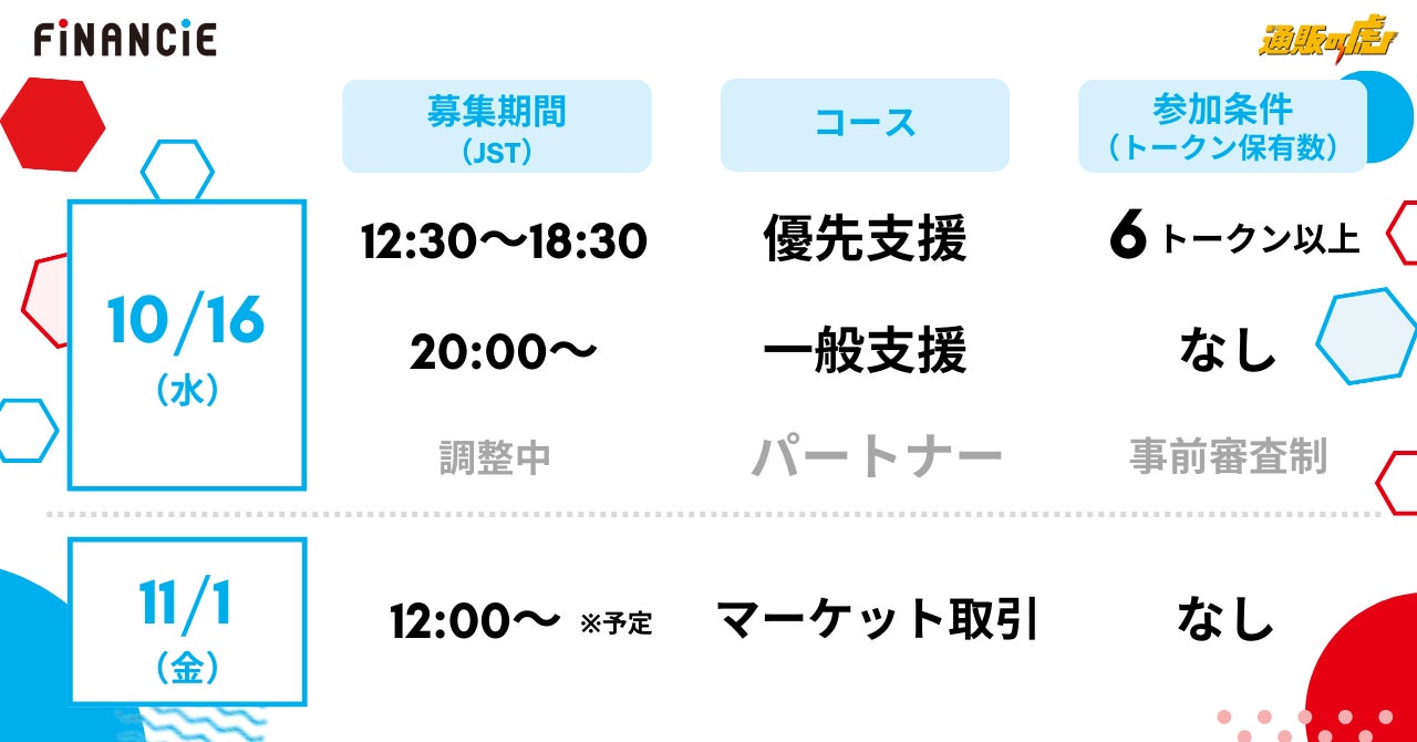 株式会社フィナンシェ(東京都渋谷区、代表取締役:國光 宏尚)は、株式会社通販の虎(東京都新宿区、代表:桑田 龍征)が運営するエンタメ型通販サイト『通販の虎』が、トークンプラットフォーム「FiNANCiE」でトークンを発行・販売することを決定しました。一般支援枠の申込は、2024年10月16日(水)20:00から開始予定です。