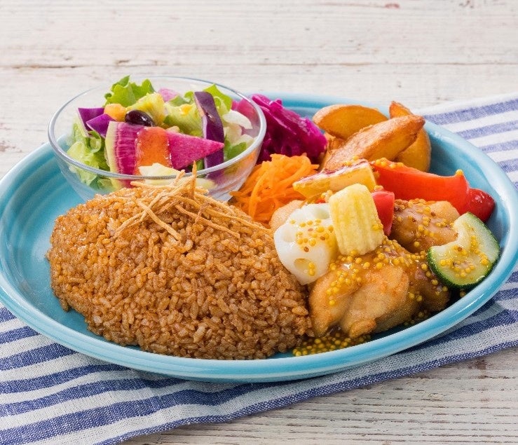 彩りの良い野菜と揚げたチキンにハニーマスタードソースをトッピングしました。