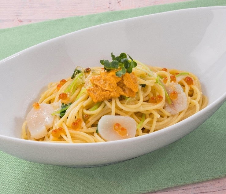ウニソースで味付けた和風のパスタに、ウニ、ホタテ、いくらをトッピングした贅沢なパスタです。