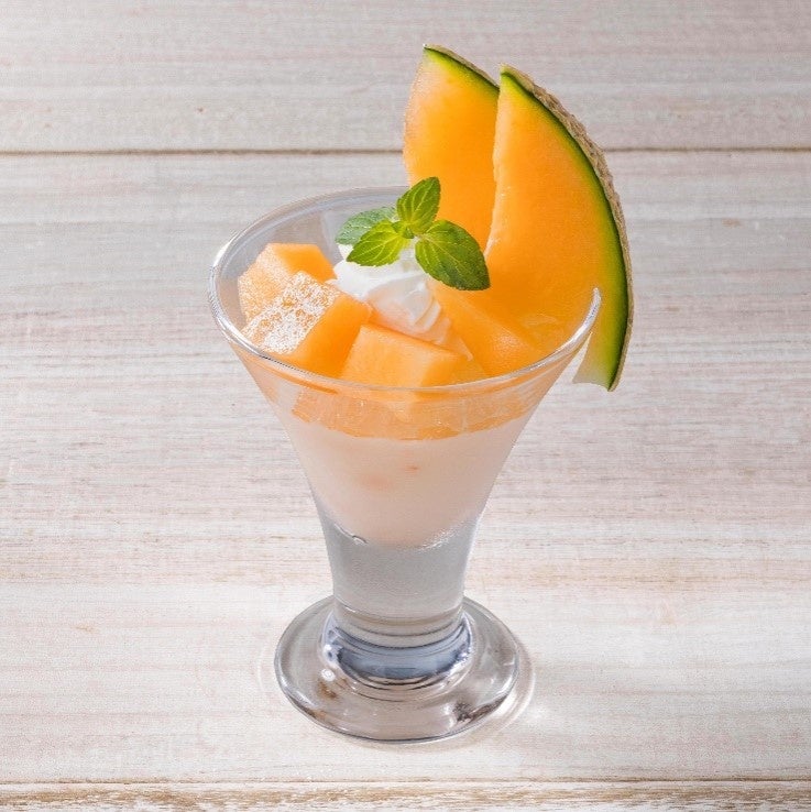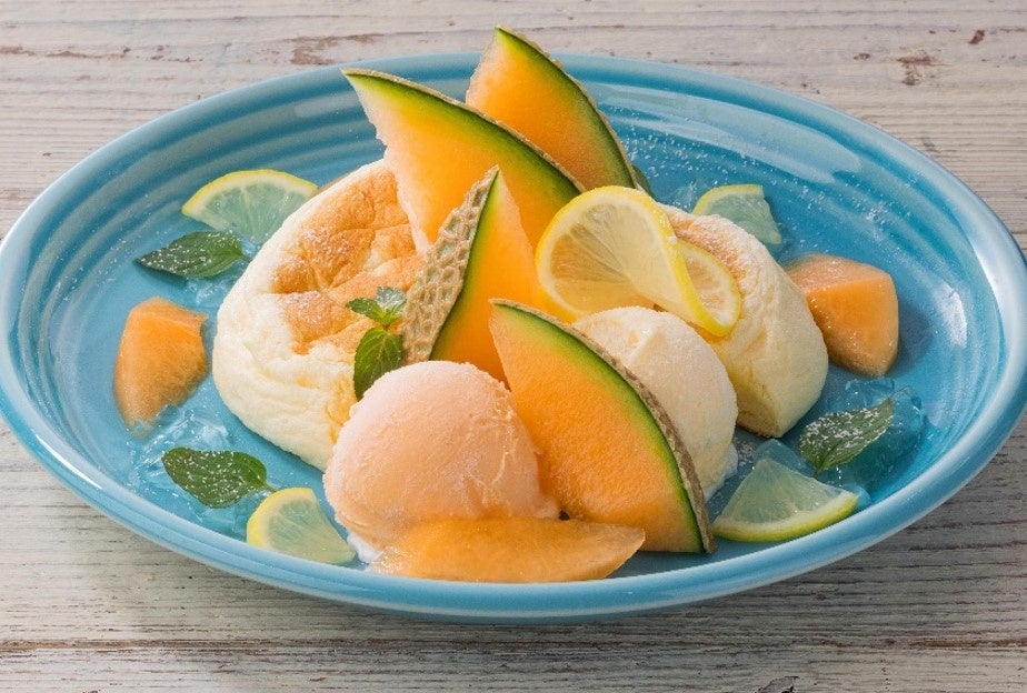 しっとり食感に冷やしたパンケーキに赤肉メロンをたっぷりトッピング。濃厚なメロンクリーム、北海道メロンアイスに爽やかなレモンゼリーを合わせました。
