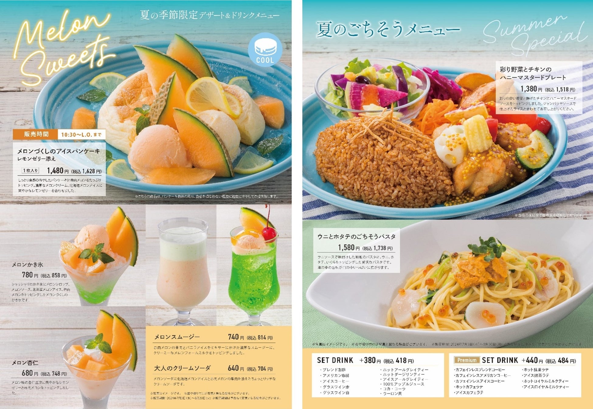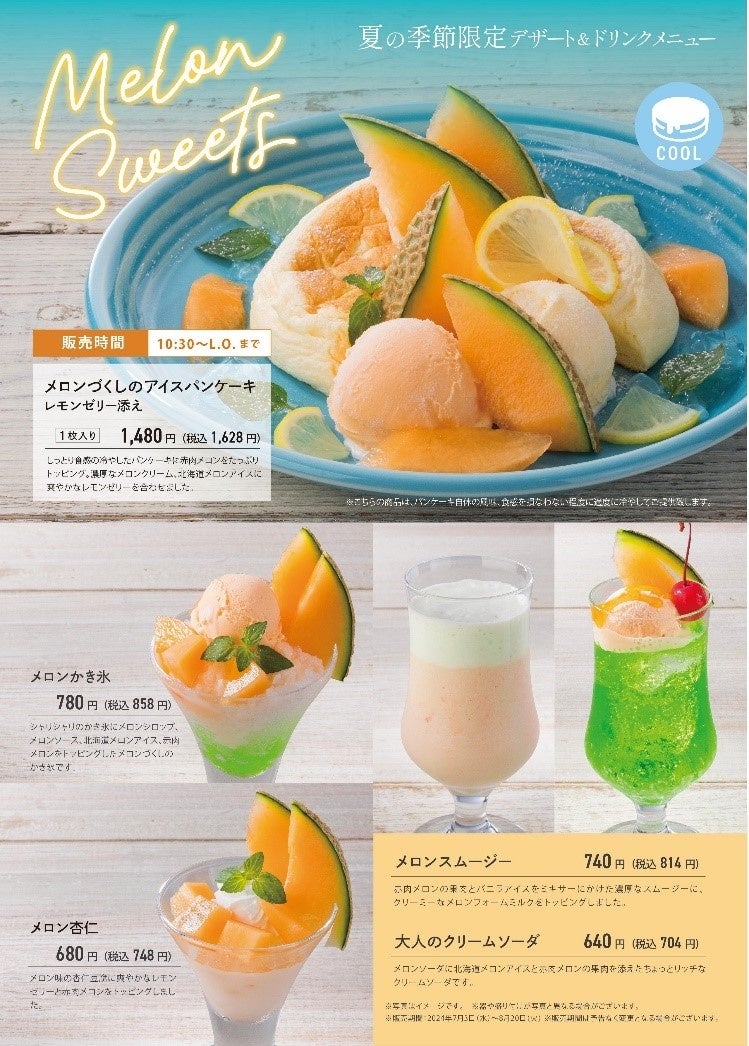 人気のふわっもちパンケーキの夏の季節限定メニュー「メロンづくしのアイスパンケーキ」をはじめ、暑い日に食べたいひんやりデザート、デザートドリンクをご用意しています。