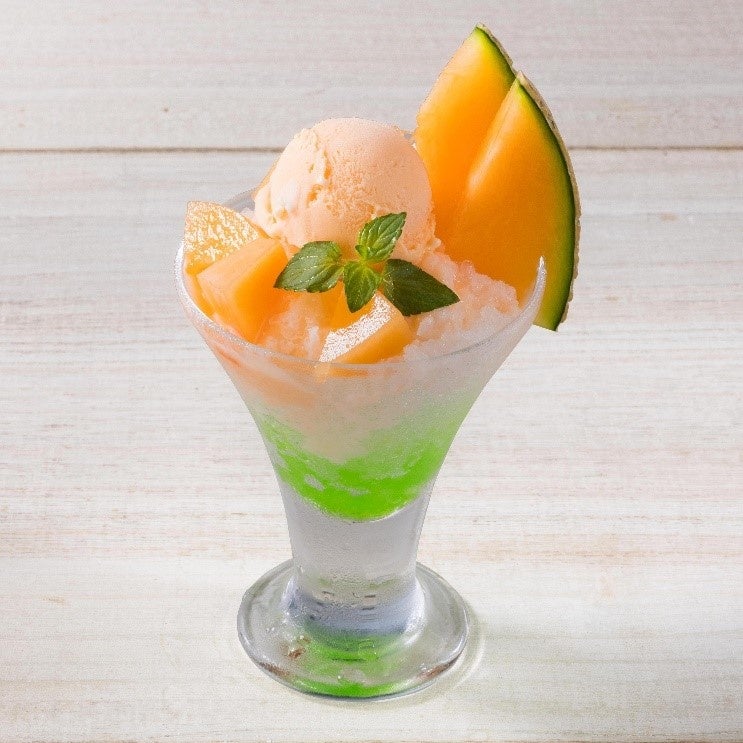 シャリシャリのかき氷にメロンシロップ、メロンソース、北海道メロンアイス、赤肉メロンをトッピング
