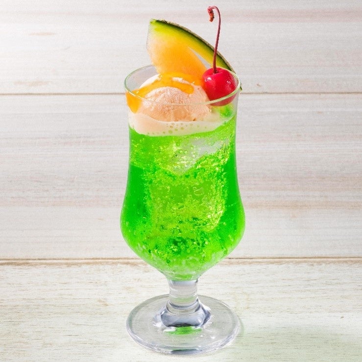 メロンソーダに北海道メロンアイスと赤肉メロンの果肉を添えたちょっとリッチなクリームソーダです。