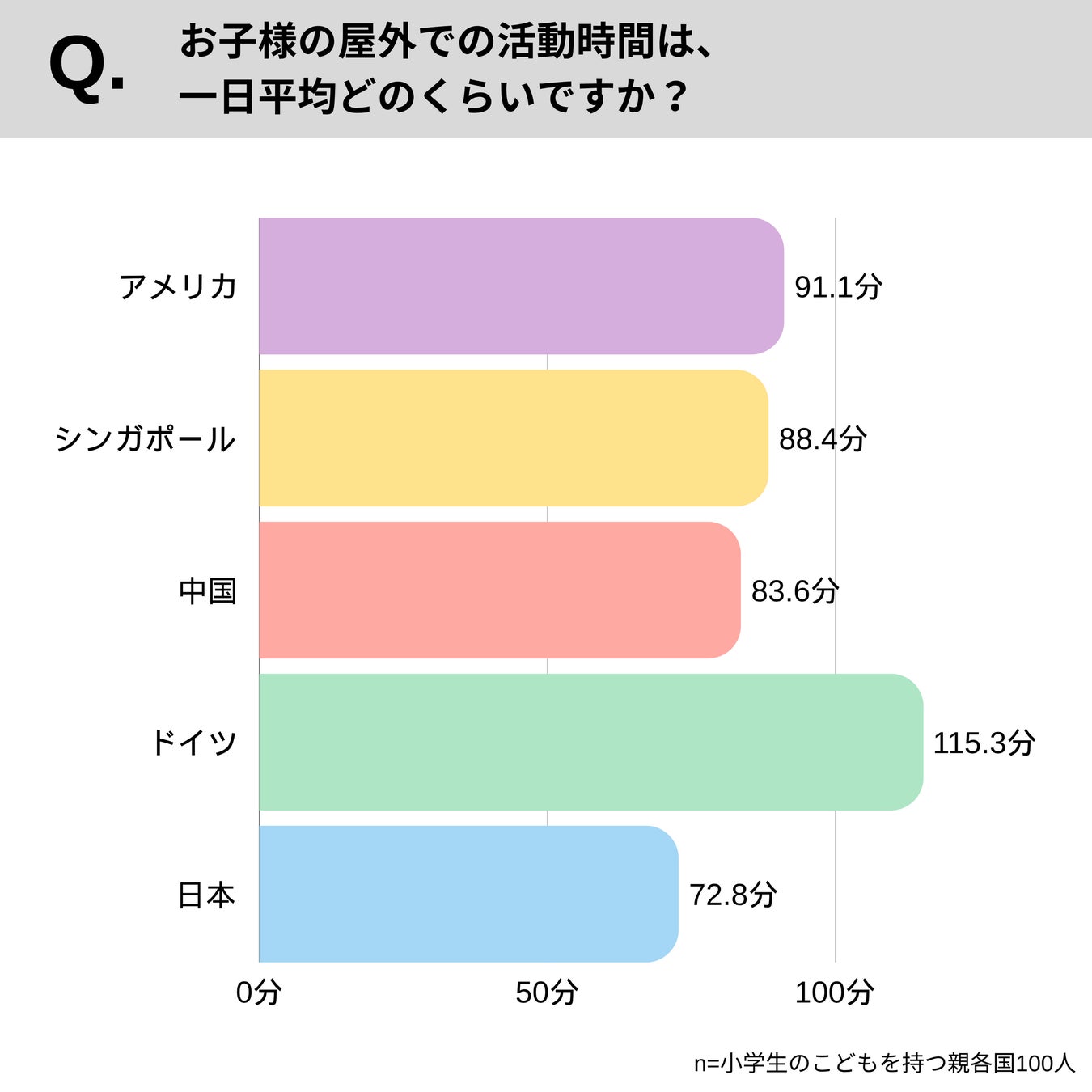 屋外活動時間の平均*⁴については、アメリカが91.1分、シンガポールが88.4分、中国が83.6分、ドイツが115.3分、日本は72.8分となり、ドイツが長い結果となりました。