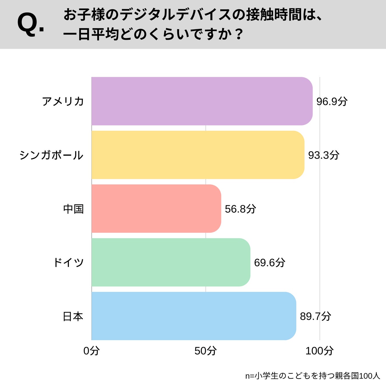 各国の保護者の回答によると、こどものデジタルデバイス接触時間の一日平均*⁴はアメリカは96.9分、シンガポールは93.3分、中国は56.8分、ドイツは69.6分、日本は89.7分となり、中国が短い結果となりました。