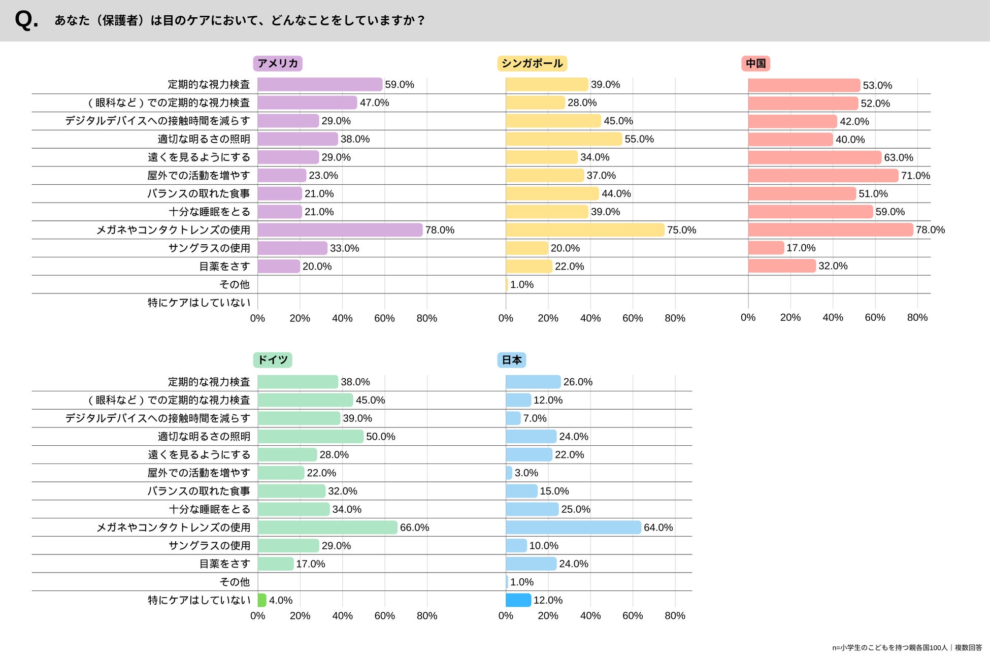 日本の保護者の回答はサンプル数が少ないため参考値ではありますが、「視力検査」「デジタルデバイスへの接触時間管理」への意識があることがうかがえます。