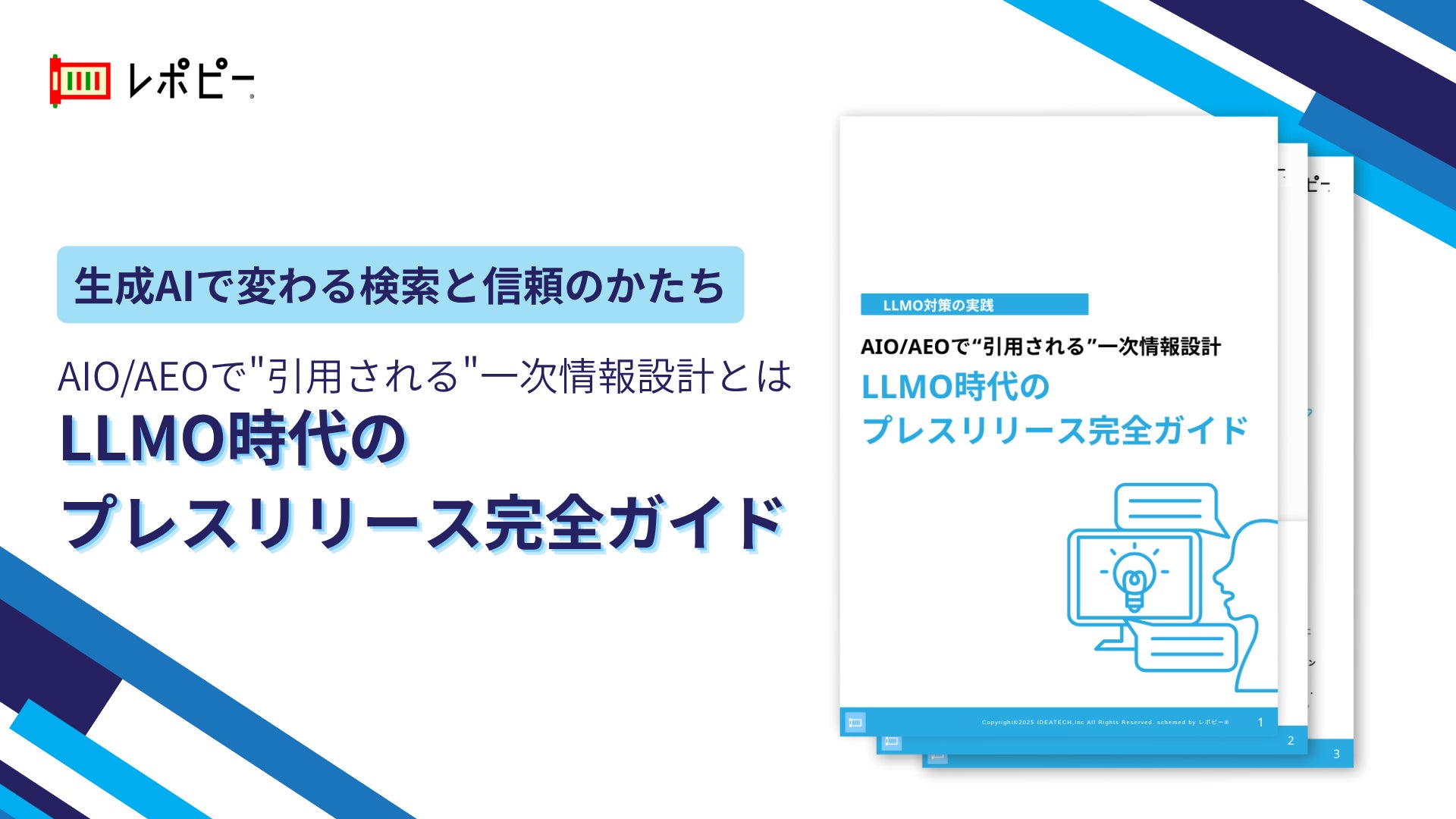 ワンストップでレポートマーケティングを実現する「レポピー®️」(https://ideatech.jp/service/report-pr)を提供する株式会社IDEATECH(本社:東京都港区、代表取締役社長:石川友夫)は、「AIO/AEOで"引用される"一次情報設計|LLMO時代のプレスリリース完全ガイド」を無料公開しました。