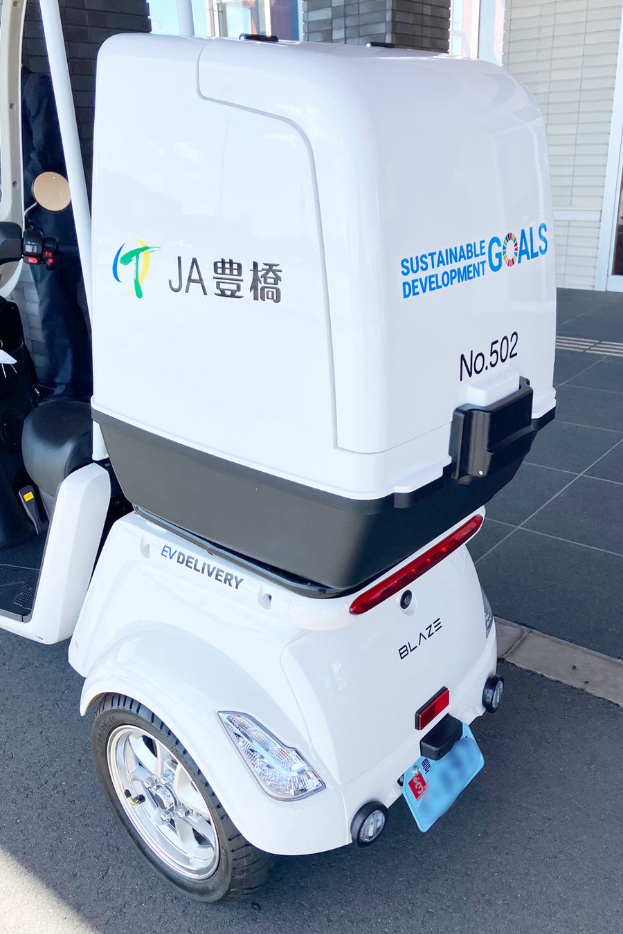 この度、豊橋農業協同組合の全13支店の内、7支店におきまして、ブレイズが提唱するブランドコンセプト「LIFE EV」(*1下記参照)の下に展開する商品の中から、電動3輪スクーター「EVデリバリー」を 1台ずつ、合計7台が初期導入されました。