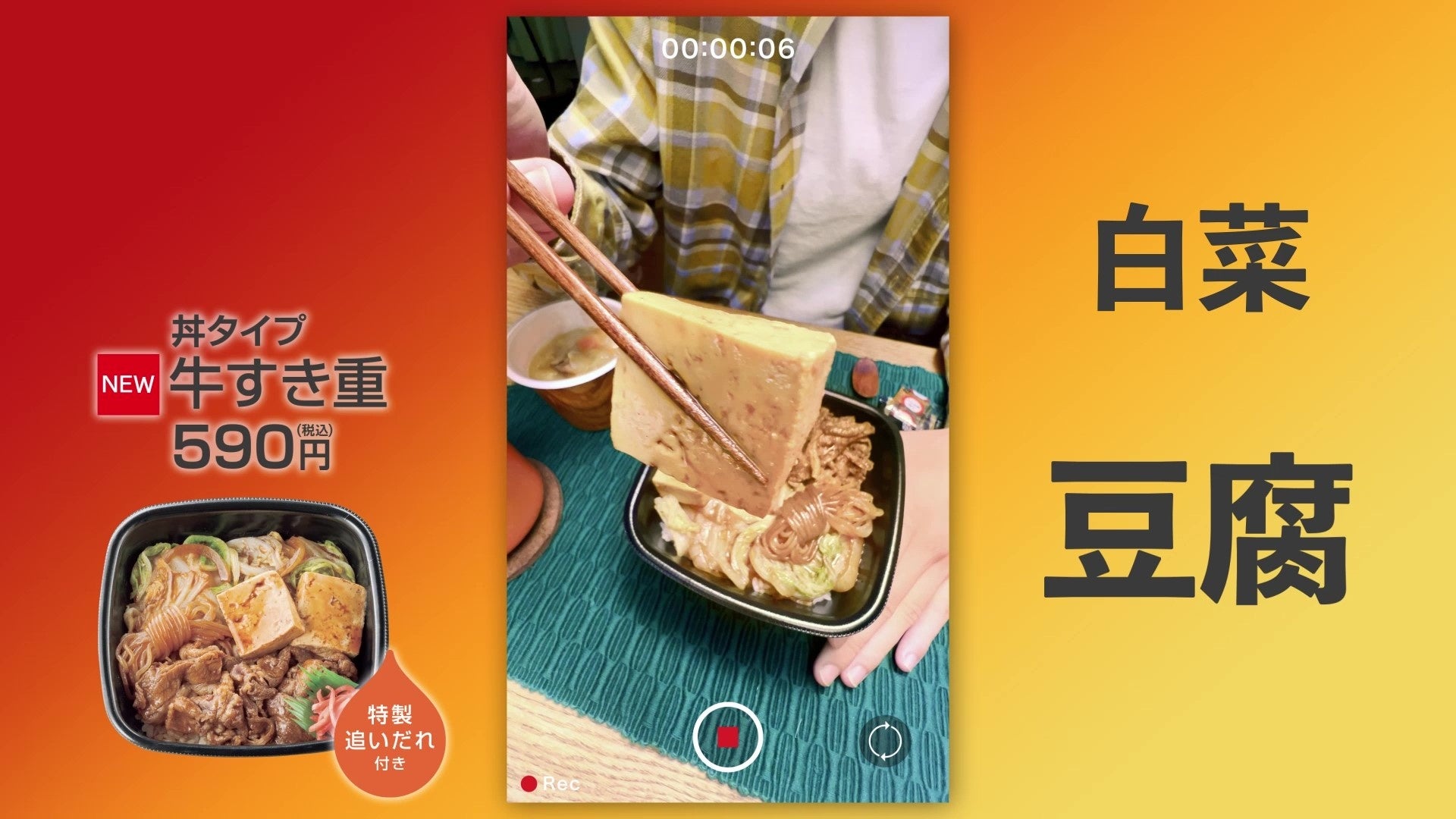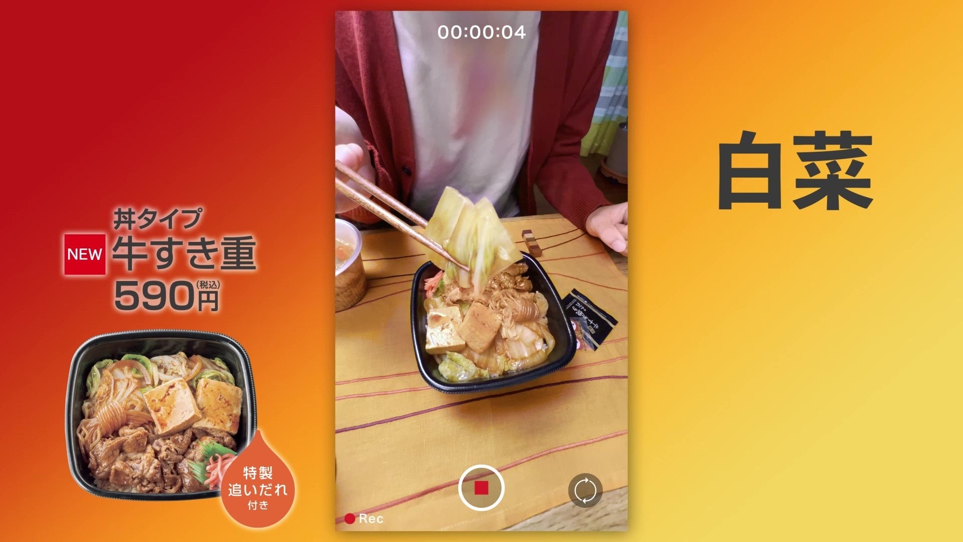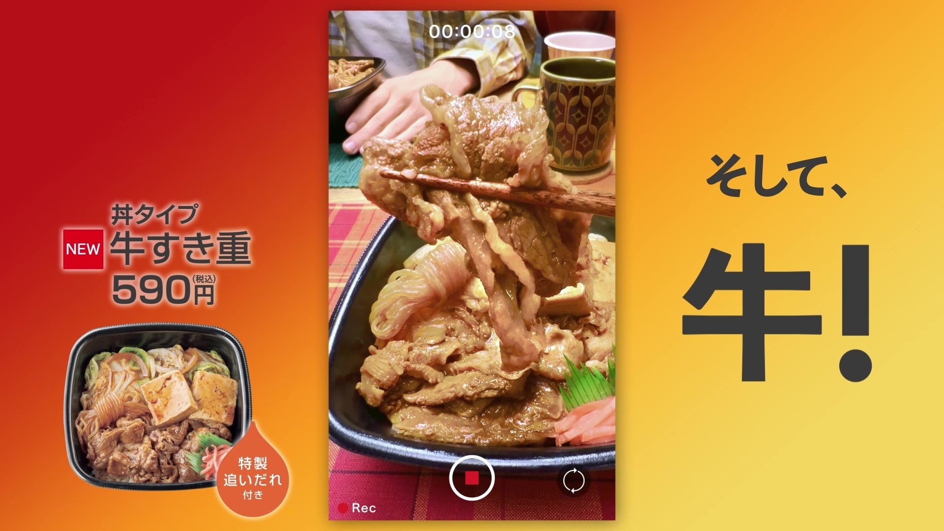 友人同士の賑やかな食事シーンの中で『牛すき重』の魅力を訴求しています。白菜、豆腐、牛肉をお箸で持ち上げて見せることで、具材のバラエティ感と美味しさ演出し、「GOCHIなSOだぜ!」というフレーズで、「すき焼き」のごちそう感と食事の楽しさを演出しています。こちらのCMは実際にスマホで撮影した映像をそのまま使用することで、リアルな表現にこだわりました。