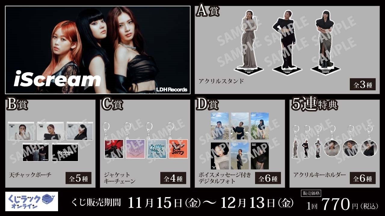 カルチュア・エンタテインメント株式会社は、2ndEP「TWENTY」のリリースを記念して『iScream』とコラボレーションした、ハズレ無しでオリジナルグッズがゲットできるオンラインくじ「くじラックオンライン」を2024年11月15日(金)より販売いたします。賞品はA賞~D賞まで、さらに、くじ1枚ご購入ごとにWチャンス賞の抽選が行われ、当選した方は特別な賞品が獲得できます。