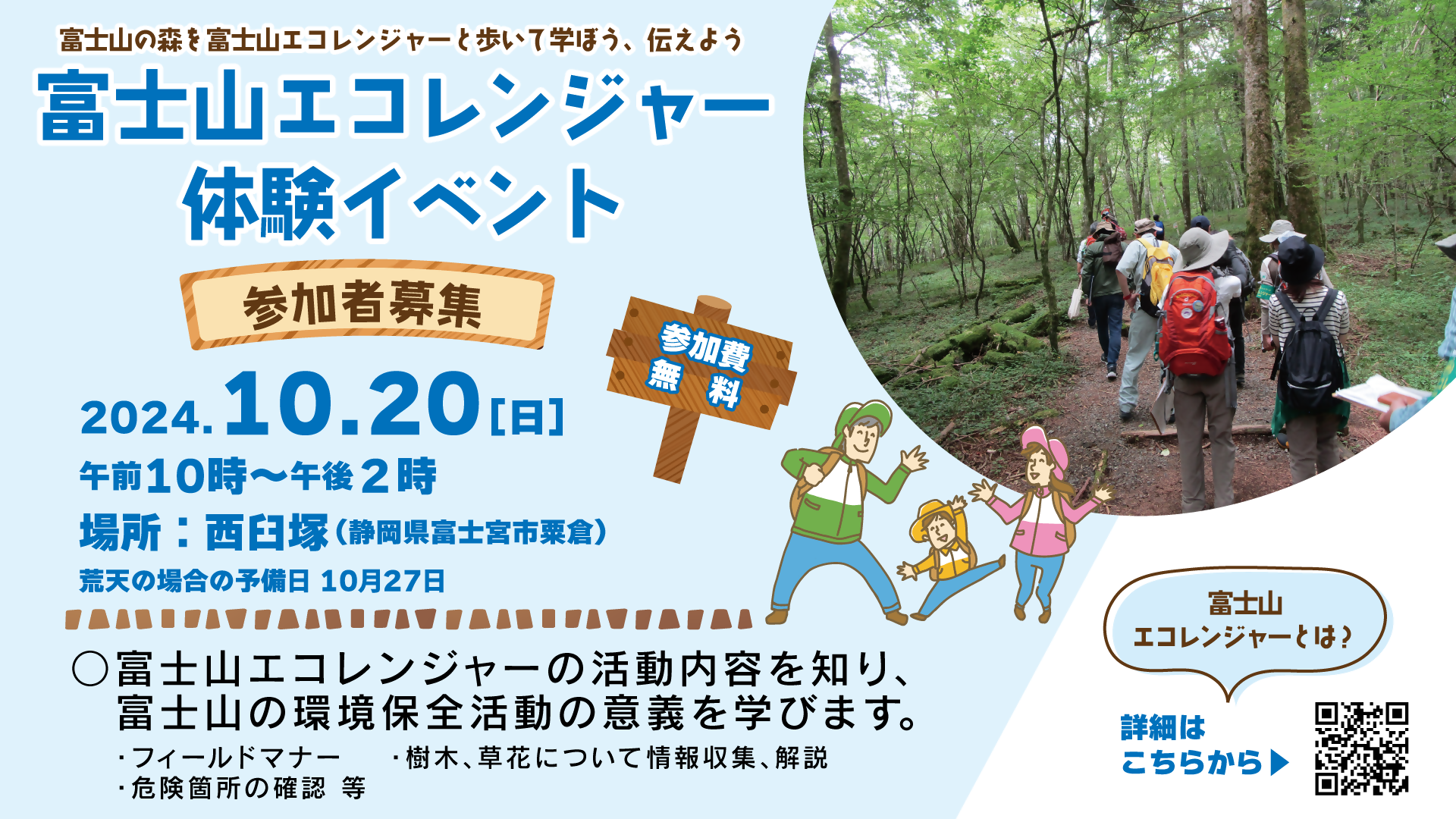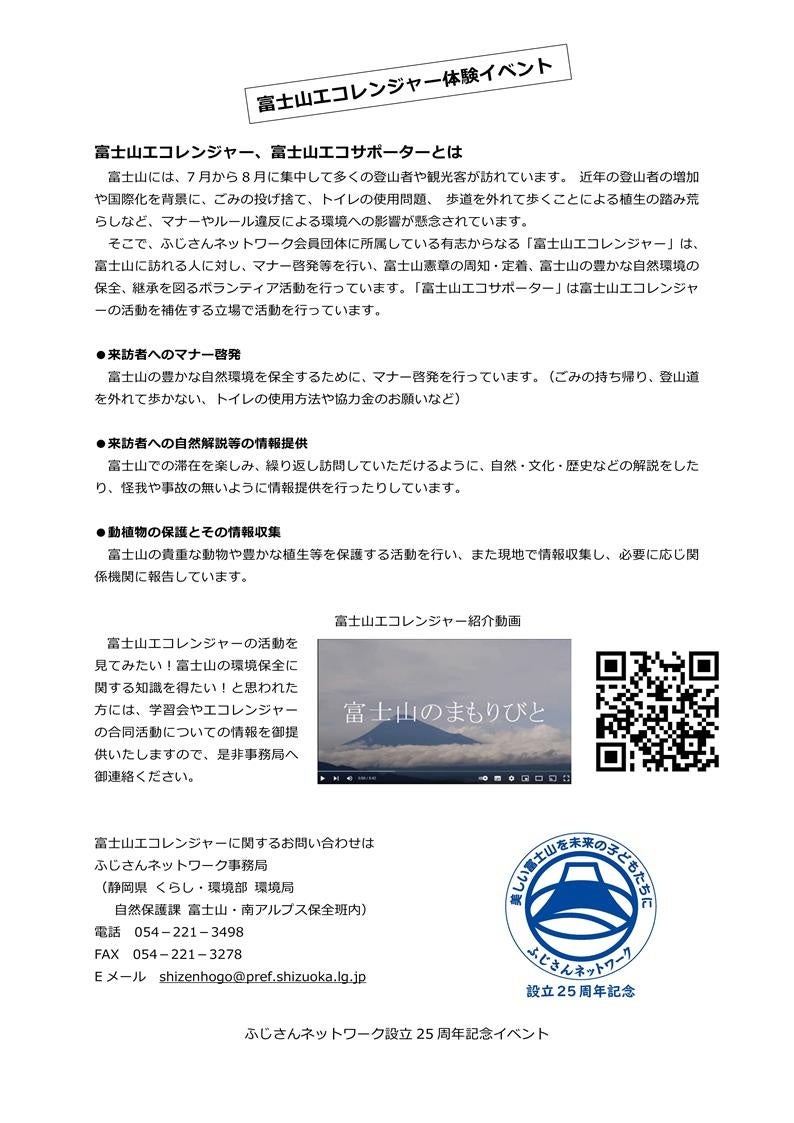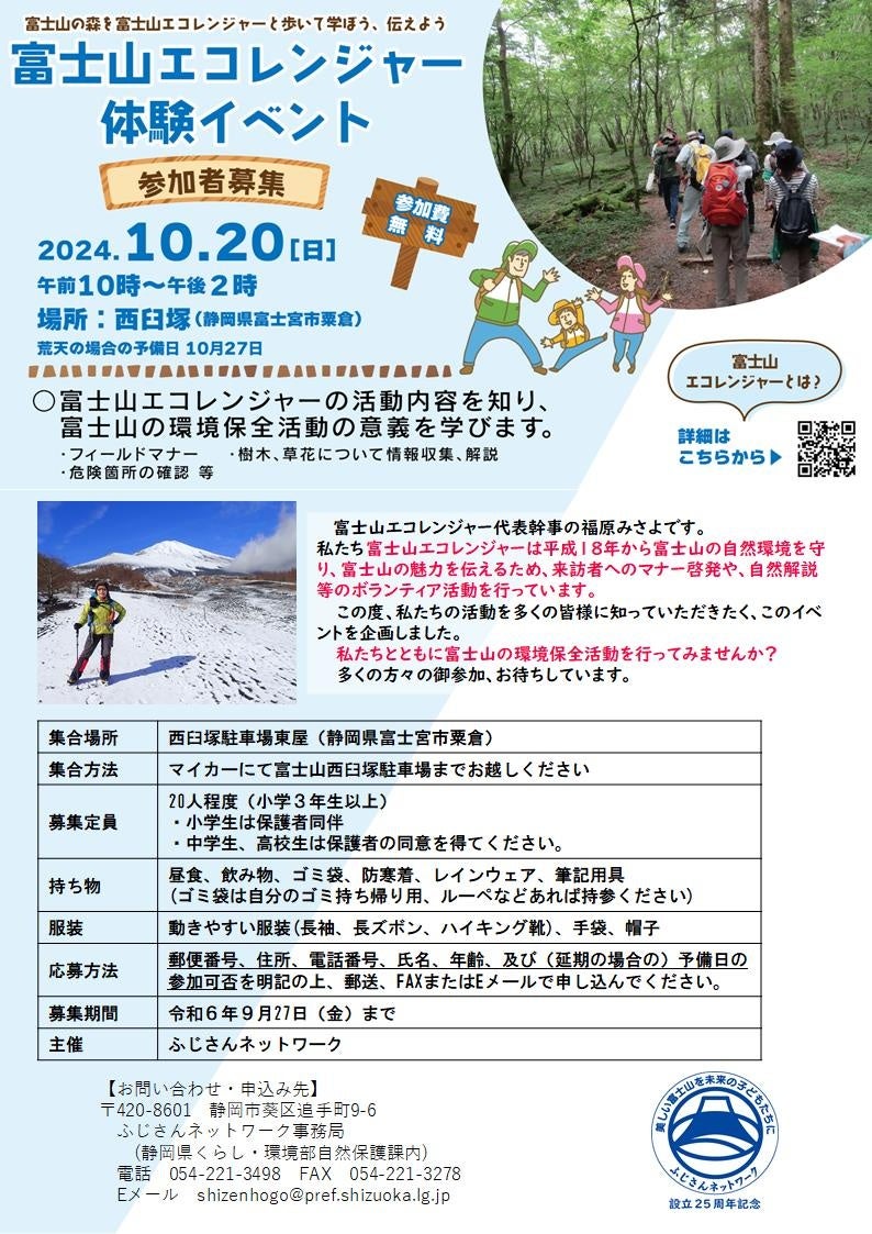 富士山の環境保全に取り組んでいる「ふじさんネットワーク(事務局:静岡県自然保護課)」が、令和6年度に設立25周年を迎えるため、記念イベントを開催します。富士山でマナー啓発等を行っているボランティア「富士山エコレンジャー」の活動内容を知り、富士山の環境保全活動の意義を体験していただくイベントです。是非御参加ください。