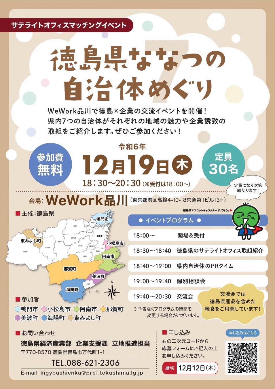 サテライトオフィスマッチングイベント「徳島県ななつの自治体めぐり」を開催いたします。
