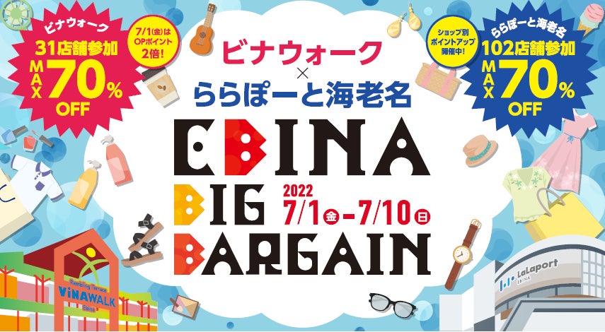株式会社小田急SCディベロップメント(本社:東京都新宿区 代表取締役社長:細谷 和一郎)が運営する海老名駅東口の「ビナウォーク」と、三井不動産商業マネジメント株式会社(本社:東京都中央区 代表取締役社長:大林 修)が運営する海老名駅西口の「三井ショッピングパーク ららぽーと海老名」では、合同バーゲン 「ビナウォーク × ららぽーと海老名 EBINA BIG BARGAIN」を、2022年7月1日(金)から7月10日(日)まで開催いたします。