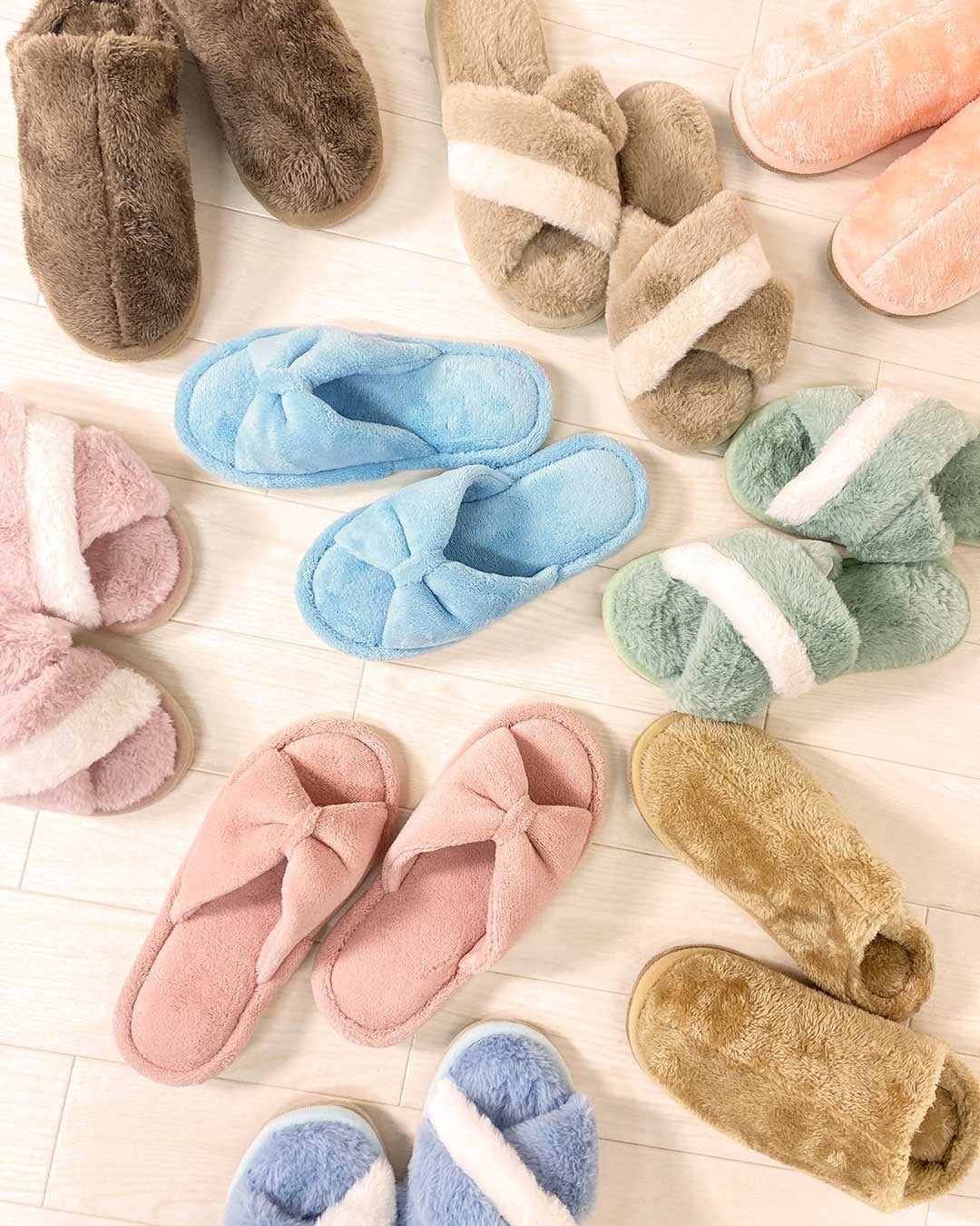 お家時間もかわいく過ごせるルームシューズは全10アイテム。大人かわいいリボンデザインやクリスクロスデザイン、指先まであったかいスリッポンタイプなど幅広い展開のためお部屋のテイストに合わせたデザインを選ぶこともできます。
