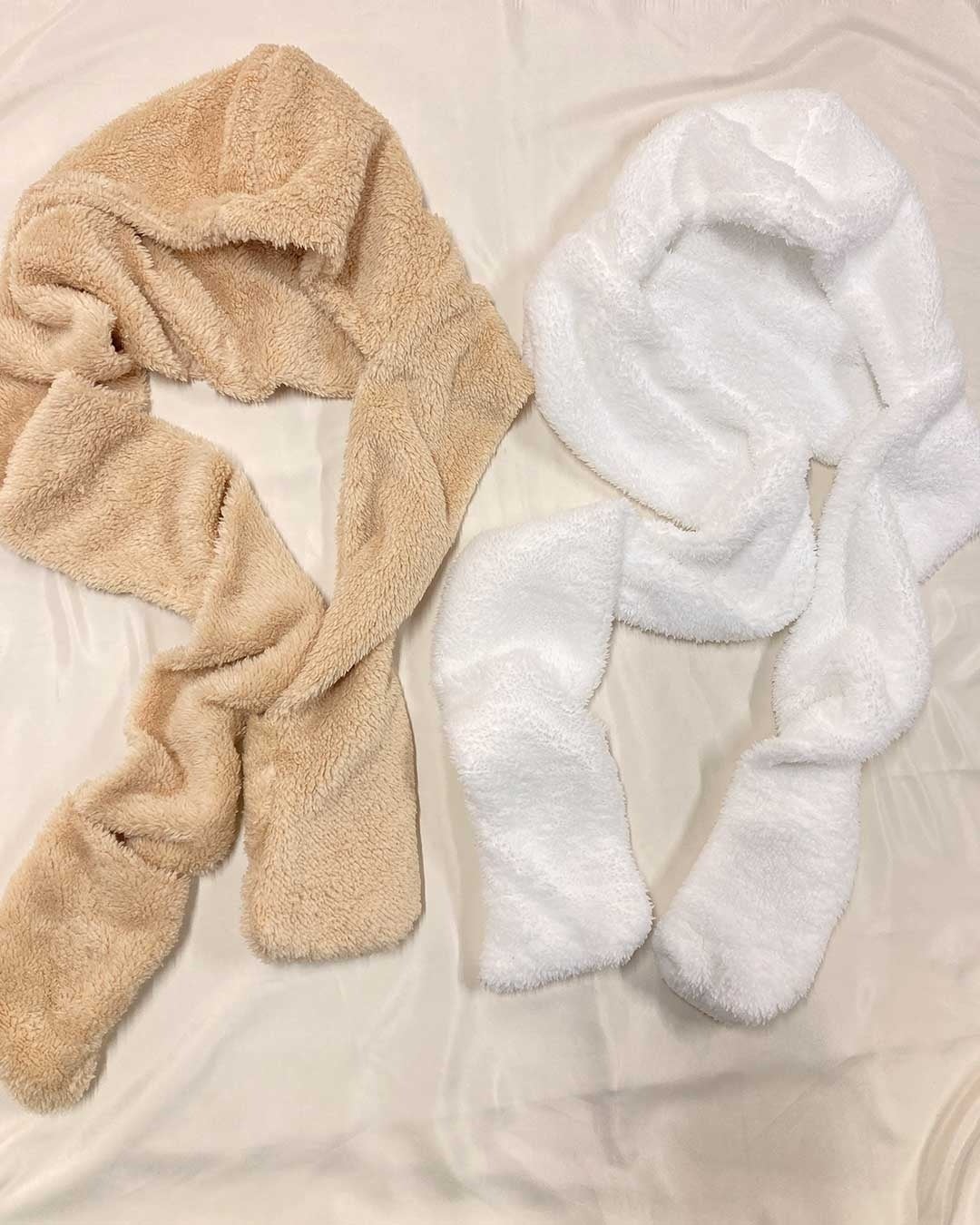 今季トレンドのバラクラバフードマフラーはホワイトとラテカラーの2色展開で登場します。もこもこ感がくまさんのようにキュートな、甘めデザインです。