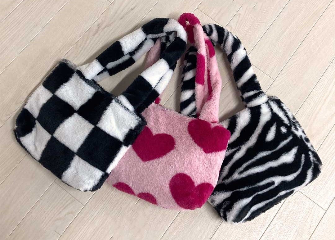 バケットハット同様にファー素材のショルダーバッグも登場します。デザインはトレンド感のあるゼブラ柄、チェッカー柄、ハート柄の3柄展開で暗めになりがちな冬コーデのアクセントになるような華やかなデザインです。