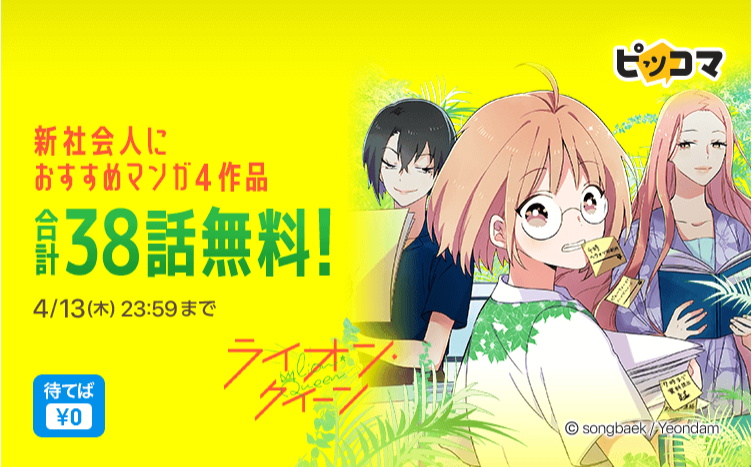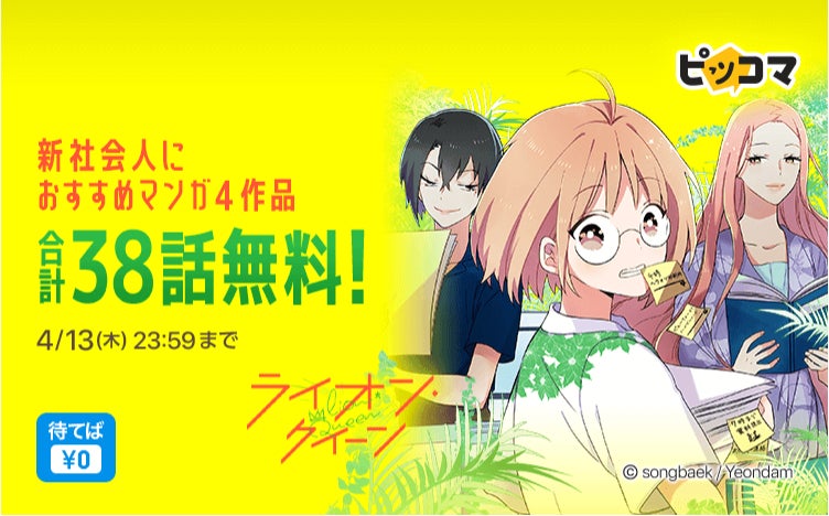 株式会社カカオピッコマ(本社:東京都港区、代表取締役社⻑:金 在龍)は、同社が運営する電子マンガ・ノベルサービス「ピッコマ」(https://piccoma.com/web/)では4/7(金)〜4/13(木)まで4月から新生活を迎えた人たちへエールの気持ちを込めて「新生活・新社会人」がテーマの人気SMARTOON4作品の無料話を増量いたします。