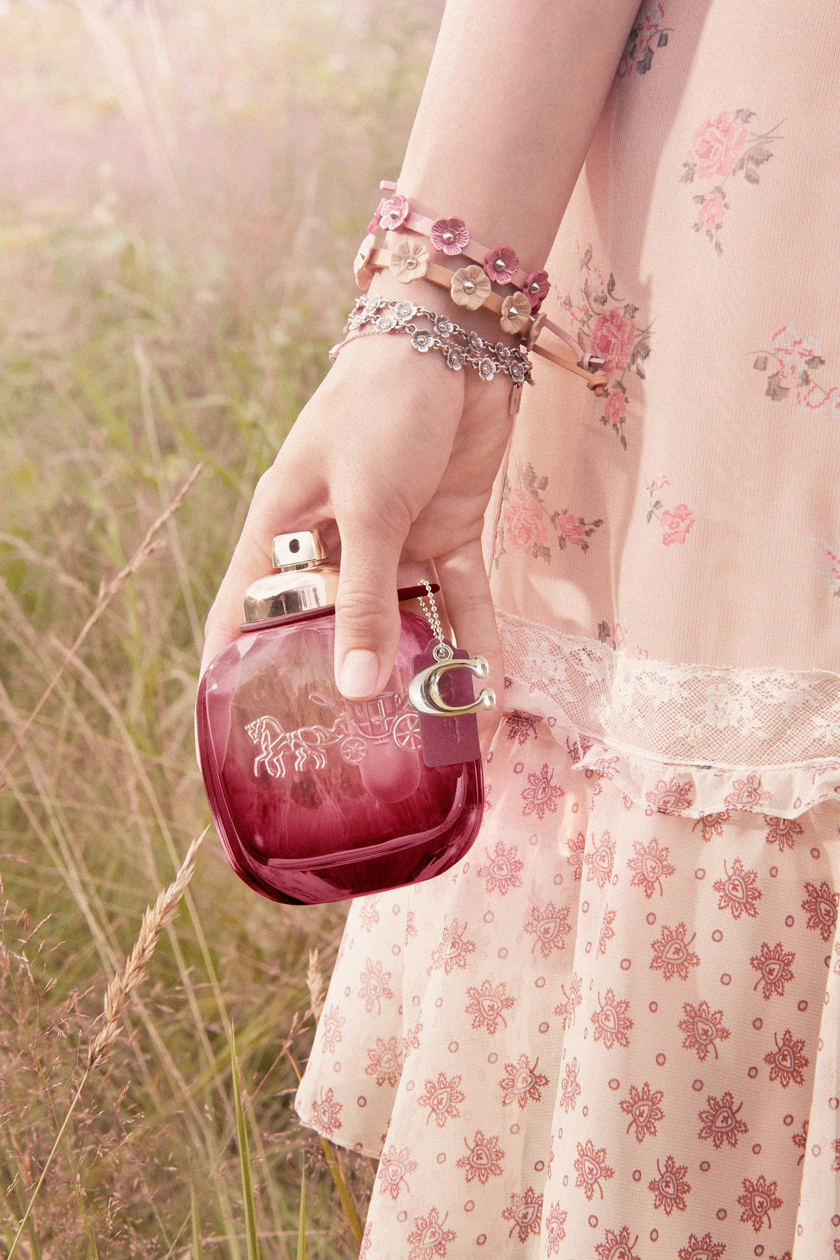 「コーチ ワイルド ローズ」は、コーチらしい自由な精神を象徴するシンボル、プレーリー フローラル プリントに着想を得ています。調香師マリー・サラマーニュは、この新フレグランスを調香するにあたり、ロマンティックな夕暮れ時への期待や喜びを描きました。