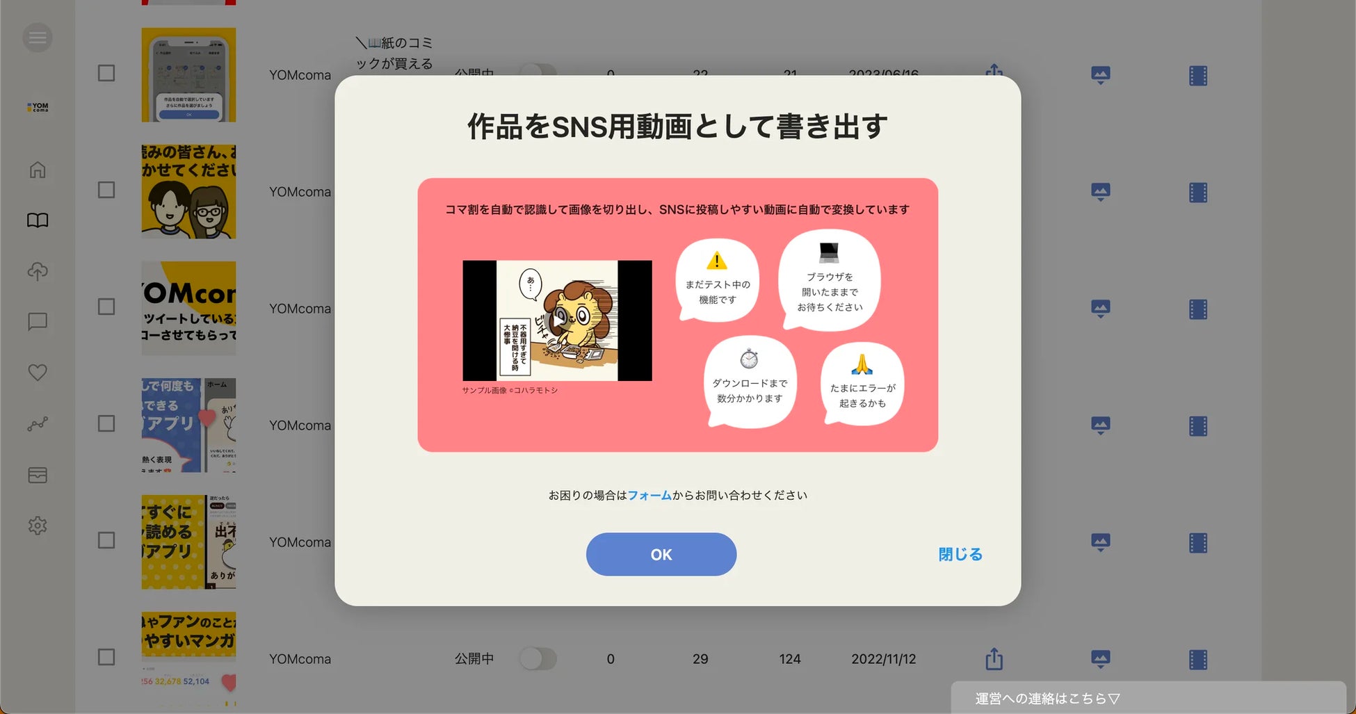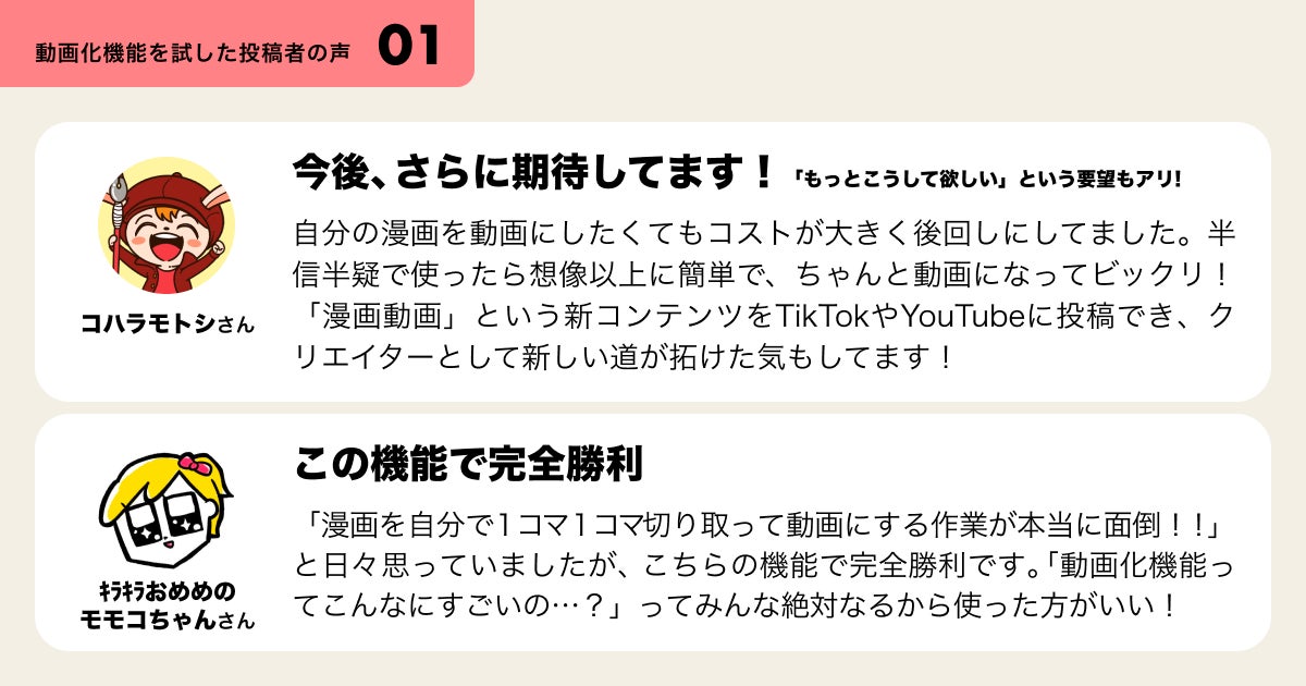 「YOMcoma」は、ショートマンガを創作するクリエイターへのヒアリングを毎週複数回実施し、サービス開発・改善を行っています。創作活動における多種多様な「困りごと」を解消する手段のひとつとして動画に着目し、マンガ画像から自動で動画を作成・ダウンロードできる機能をリリースしました。他にもショートマンガの創作活動や、作品をより多くの方に届けるための支援として、新たなサービスや機能を検証・検討しており、今後もクリエイターにとって価値のあるサービス開発・改善を行ってまいります。