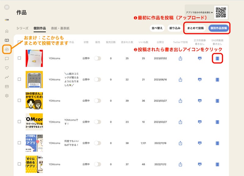 (2)作品が投稿できたら、作品ページ → 個別作品タブの右列の動画アイコンをクリックしてください。