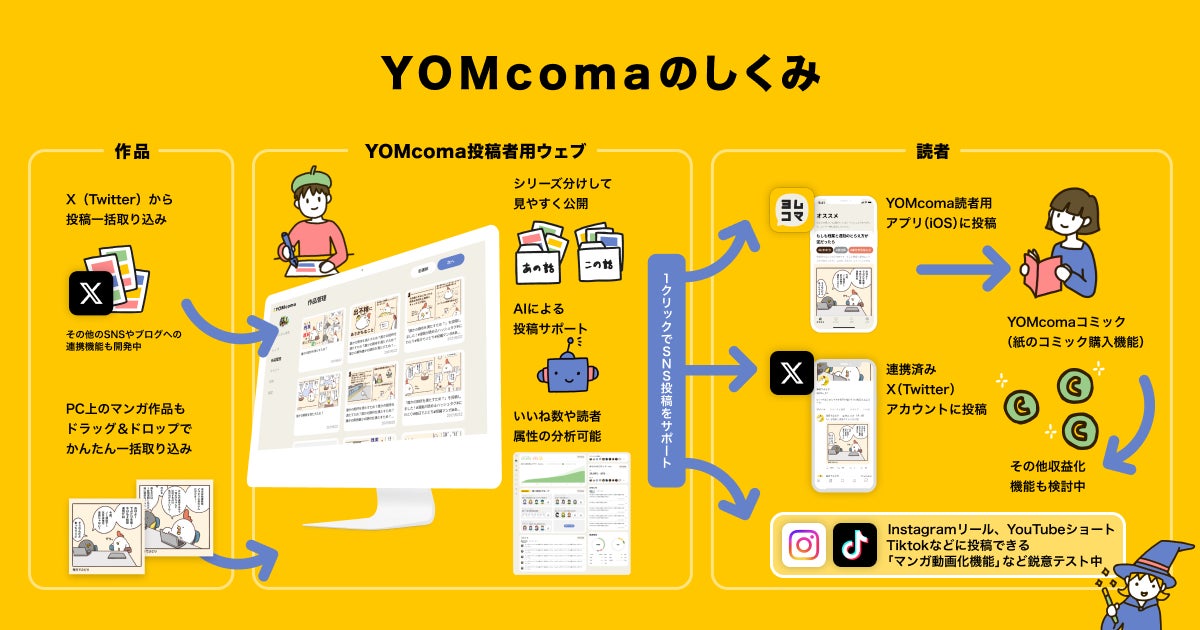 「YOMcoma(よむこま)」は、クリエイターが利用する作品用投稿ウェブサイトと読者がマンガを読むアプリの総称で、ショートマンガのクリエイターが創作活動に集中できるよう、様々な角度から支援を行っています。