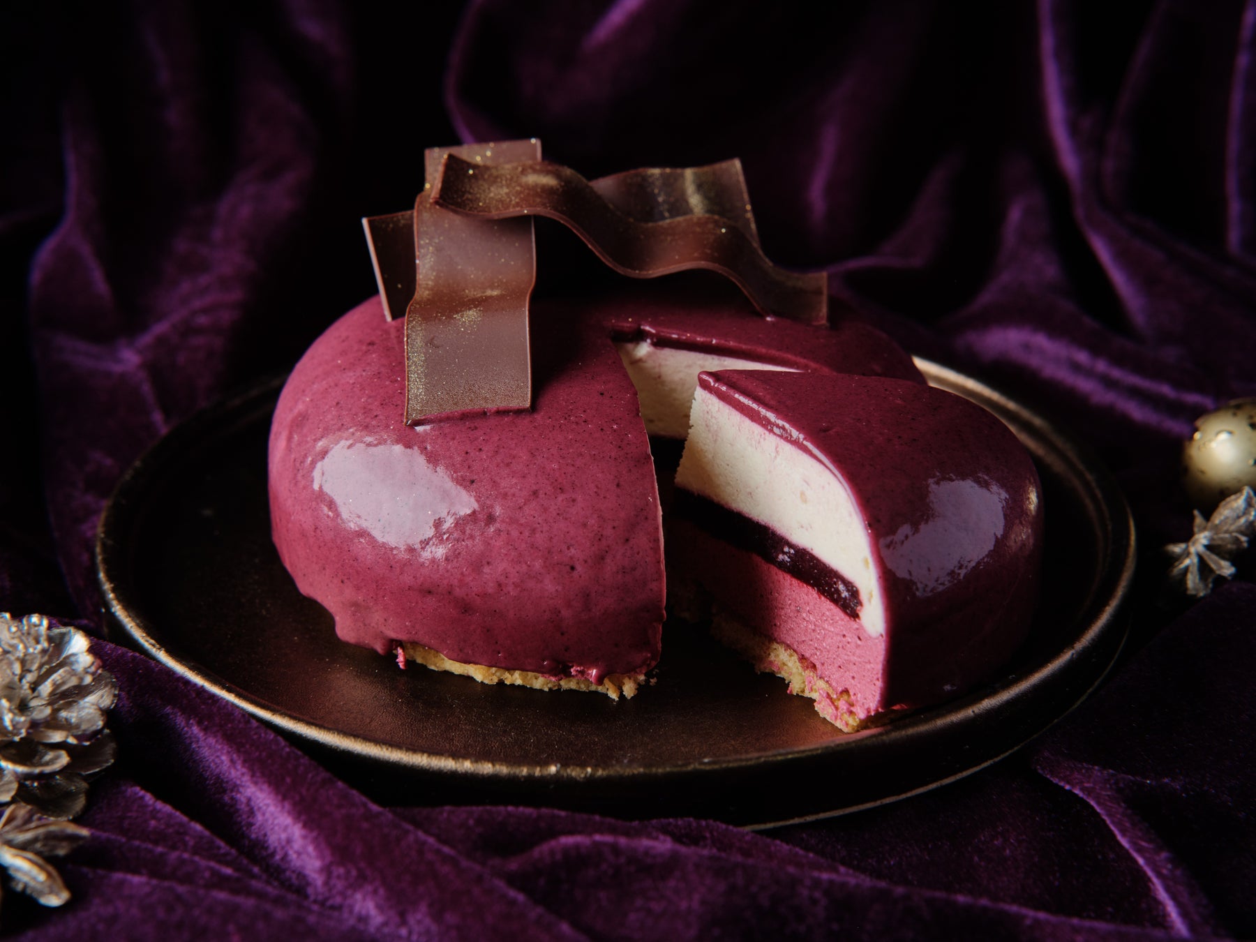 サクサクとした塩気のあるバタークッキーを土台に、カシスにオレンジリキュールをほのかに効かせた甘酸っぱいムースを重ね、その上には酸味が際立つカシスのジュレをしのばせました。さらに、シャンパンの香りを損なわないよう丁寧に仕上げたシャンパンムースを重ねることで、ケーキ全体に丸みのある味わいを与えます。仕上げには、深いボルドー色のカシスピュレのコーティングをまとわせ、すべての層をひとつにまとめました。カクテル「キールロワイヤル」から着想を得た5層の味わうが織りなすこのケーキは、シャンパンとともに楽しむのがおすすめです。