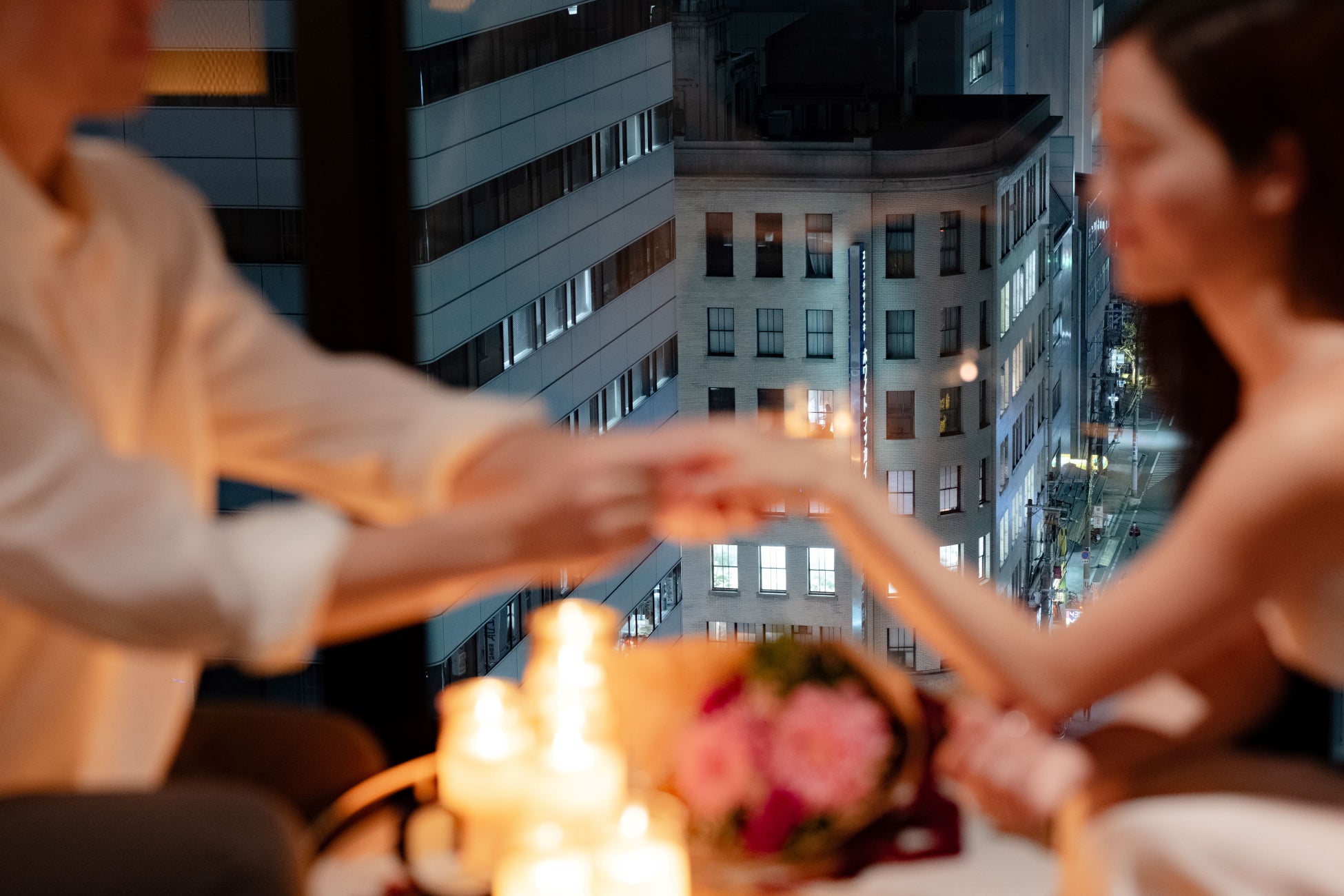 クリスマスイブには、最上階バーを完全貸切にして、夜景とキャンドルの灯りに包まれた空間で、特別なプロポーズを演出いたします。大型スクリーンではお二人だけの思い出の映像を上映可能。ディナーや装飾は、事前にスタッフとご相談いただくことで自由にカスタマイズできます。