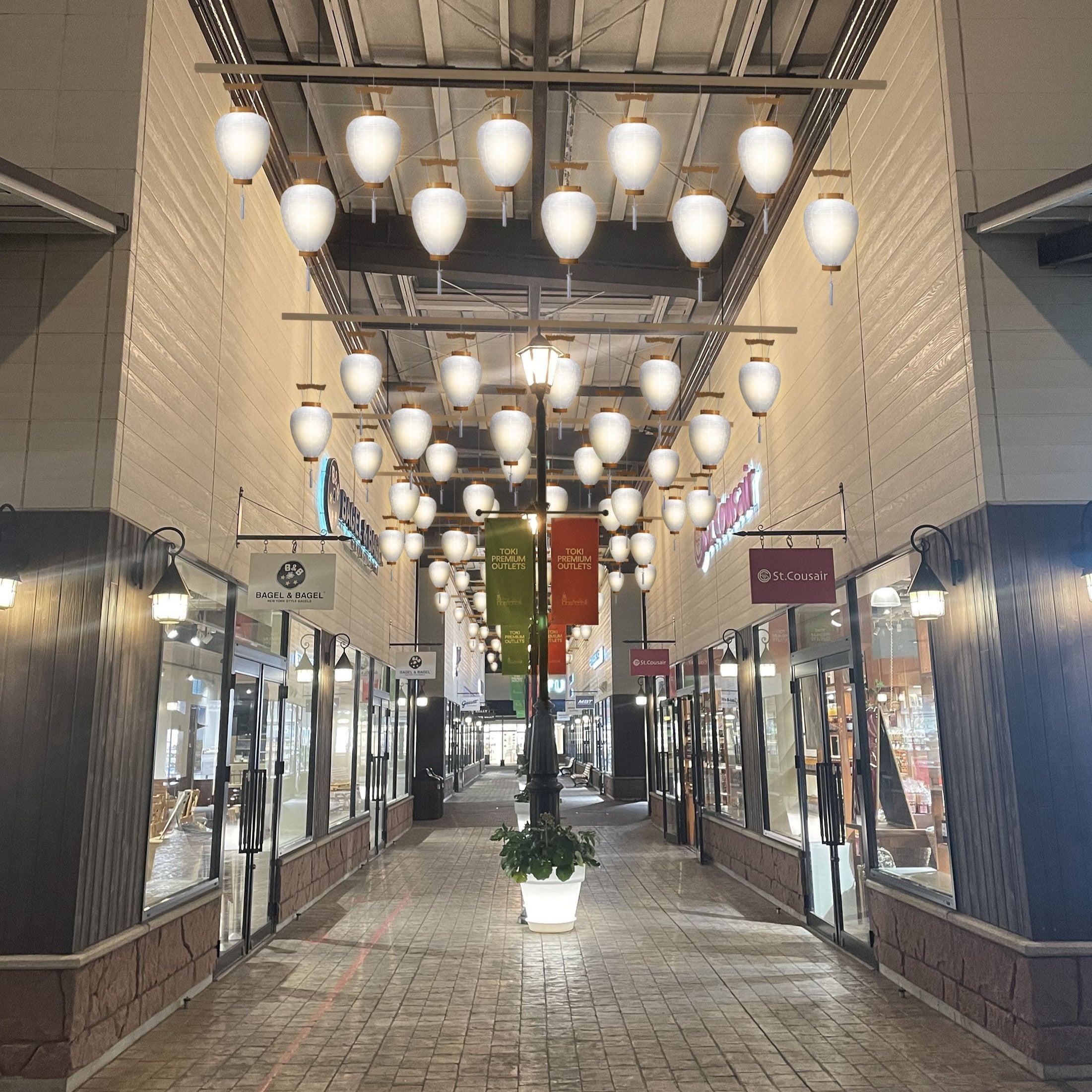 大正10年に創業した地元の老舗「安藤商店」の協力のもと、アウトレット内のアーケードに約100個の岐阜提灯を飾ります。昼間は提灯ならではのお祭り気分を感じられるとともに、日没が近くなると、美濃紙を通して光る優しい灯りがアーケードを照らし、土岐プレミアム・アウトレットに岐阜の伝統を感じさせる夕暮れが訪れます。