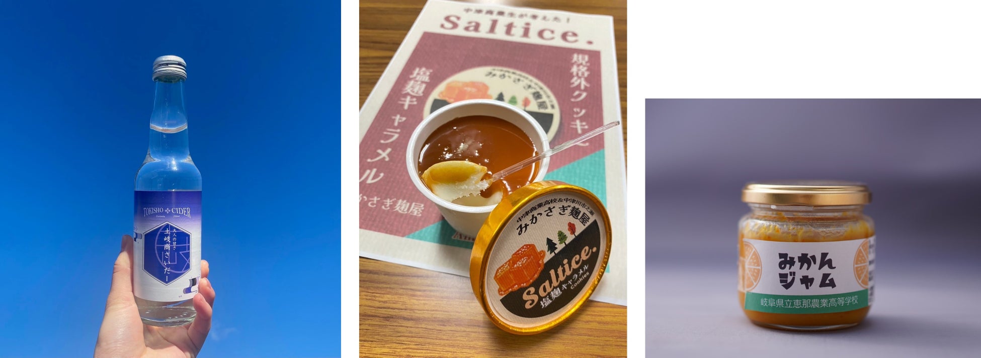 販売商品は、土岐商サイダー(土岐商業高校が地元企業と協力してラベルを考案し、企画・開発)、みかんジャム(恵那農業高校生徒さんの手作り)、塩麹アイス(中津商業高校による開発商品)の3点を取り扱います。