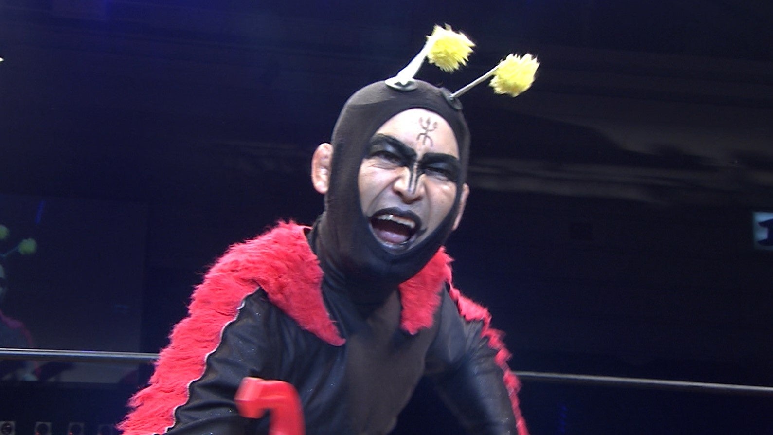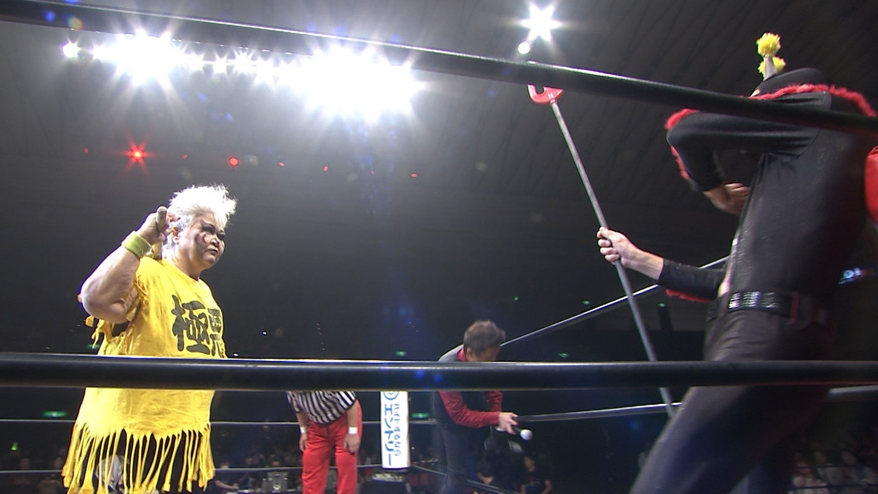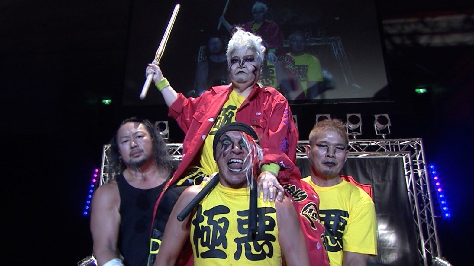 DRAGONGATE初参戦のダンプ松本選手は、“極悪”と書かれたシャツに身を包み、吉田隆司選手・堀口元気選手・望月成晃選手が組む騎馬に乗り、竹刀を持って登場!また、当時のリング上を思わせるかのように、縦縞のシャツに赤いパンツを履いたドン・フジイ選手がレフェリーを務めます。
