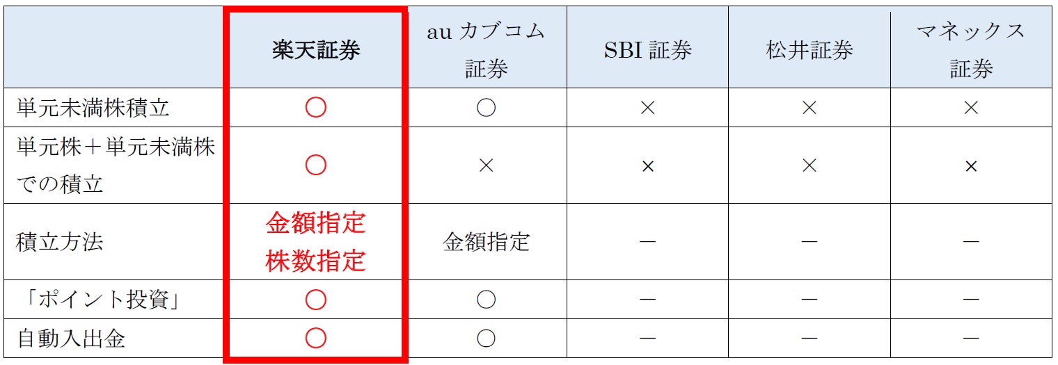 積立方法 | ・金額指定:1回の注文金額を指定、その金額内で購入できる株数を発注 ・株数指定:1回の注文株数を指定、その株数を発注 |