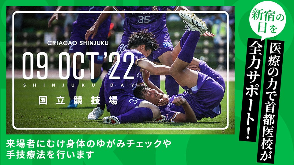 新宿駅前にある医療・福祉・リハビリ業界の各分野で活躍する医療人を育成する専門学校 首都医校では、10月9日(日) 国立競技場で行われるJFLクリアソン新宿vs 鈴鹿ポイントゲッターズ戦(通称“新宿の日”)に、スポーツトレーナーを育成するアスレティックトレーナー学科による身体のゆがみチェックや手技療法体験など、さまざまな催し物を用意し、医療の力で“新宿の日”を全力で盛り上げます。