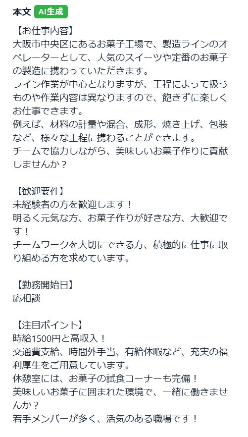 例えば、求人媒体に出稿している項目に合わせて登録したフォーマットを選択して文章を生成すれば、後から文章を媒体用に調整する手間を省くことができます。