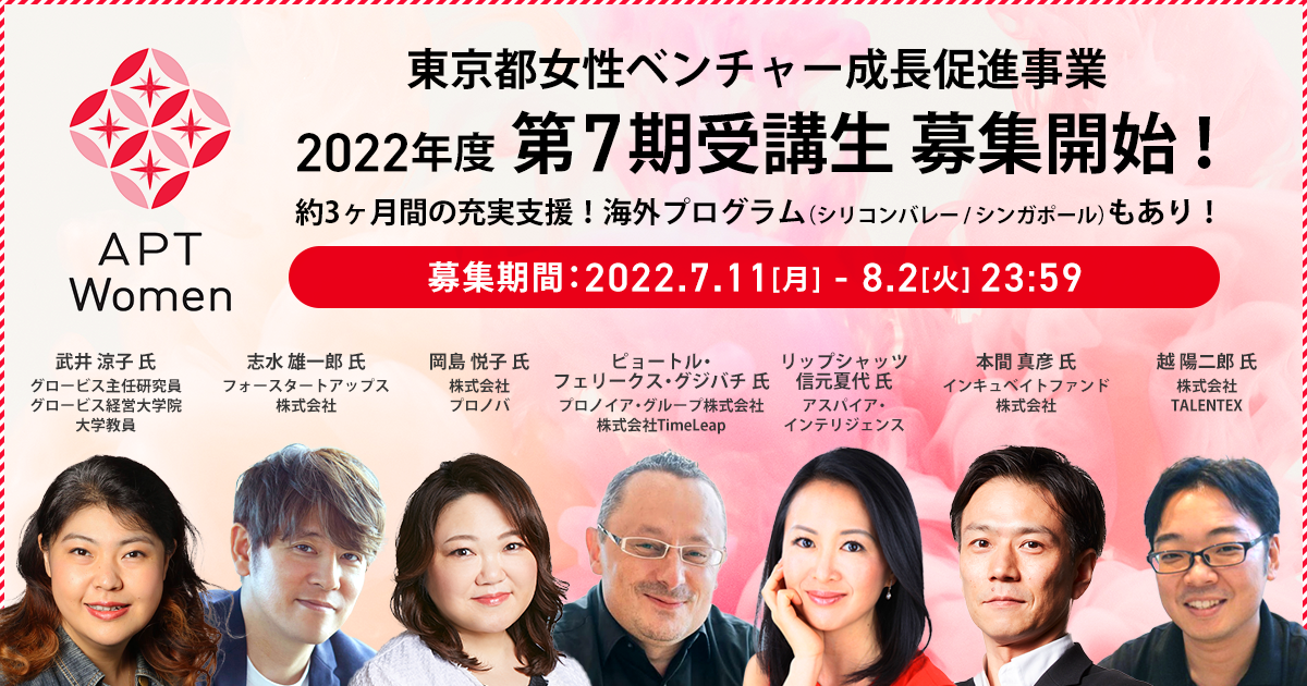 東京都女性ベンチャー成長促進事業「APT Women(※)」は、第7期受講生を2022年7月11日(月)より募集いたします。