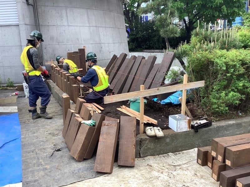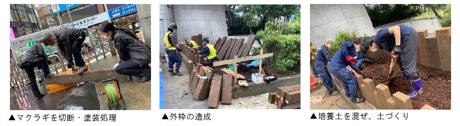 〇JR東日本管内で実際に使用しているマクラギを、JR新宿駅の社員が切断・塗装処理し、㈱昭和造園さまのご協力によって、外枠を造成しました。
