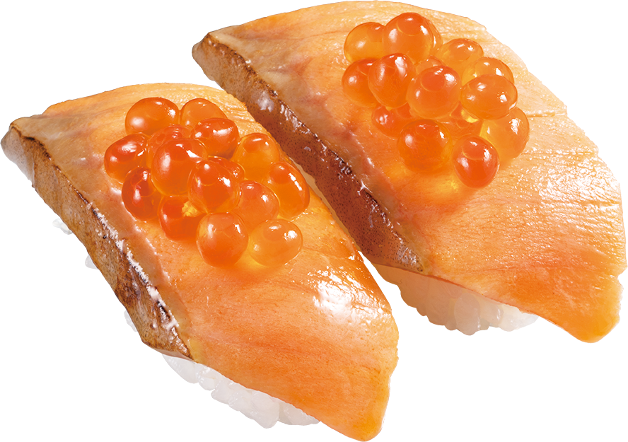 かっぱ寿司オリジナルのだし醤油を塗って炙ったサーモンに、いくらを乗せてお寿司仕立てでご提供します。