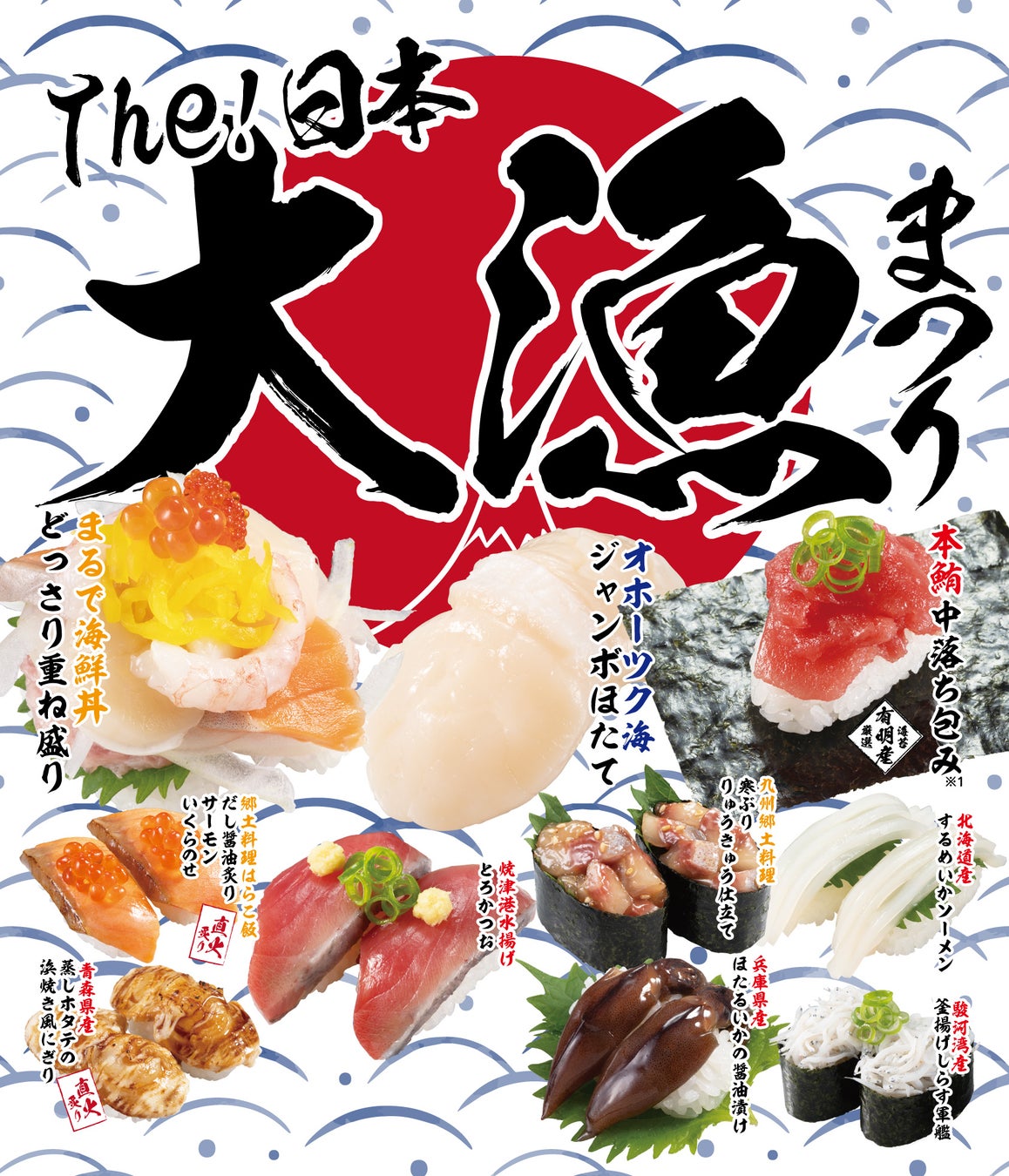 そんなかっぱ寿司2022年最初のフェアは、お寿司で日本を元気に!日本は“うまい!”の宝庫だ!と再認識できる、北は北海道、南は九州まで日本の“うまい!”を集めた「The!日本 大漁まつり」フェアを開催いたします。