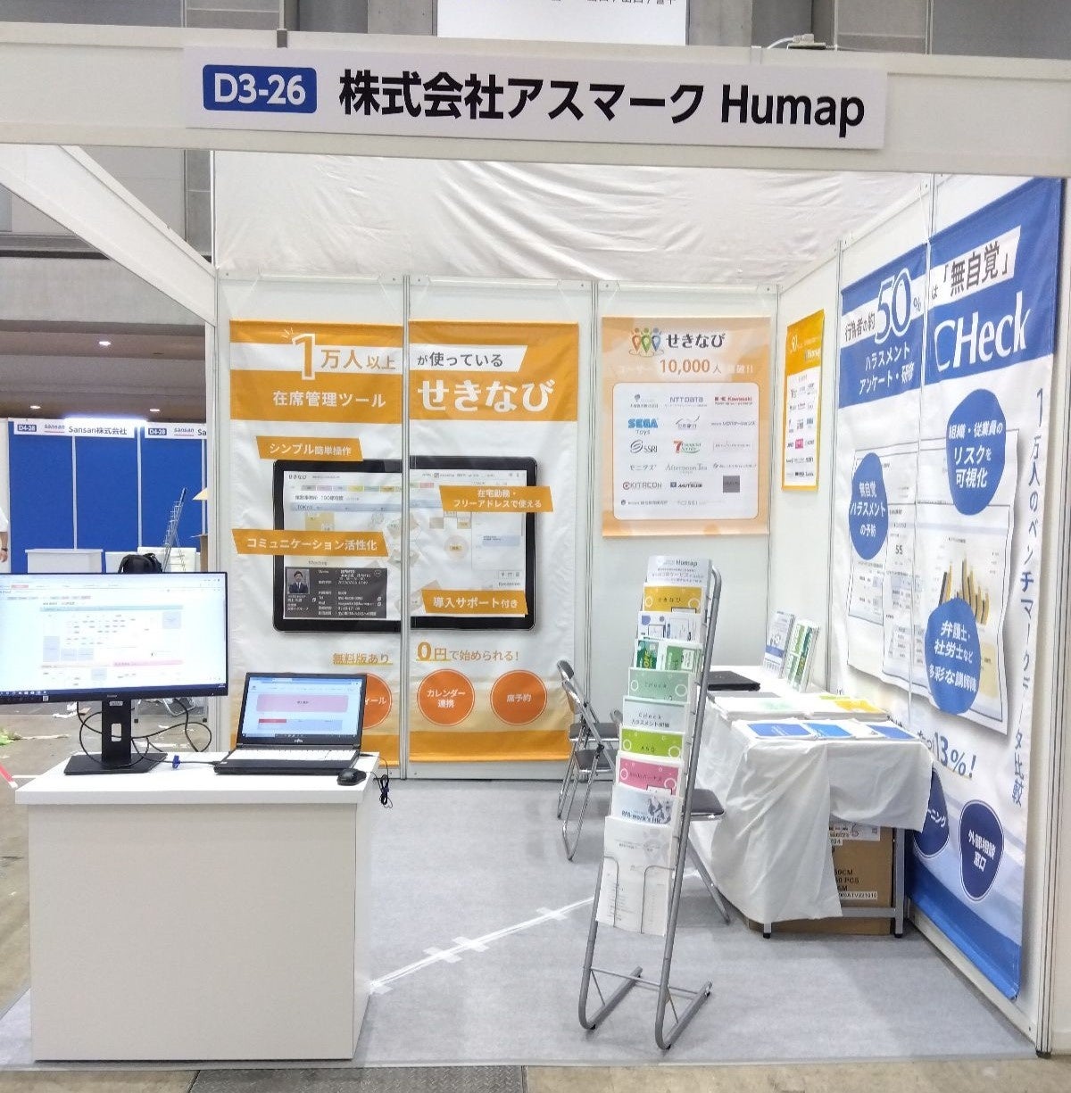 Humapのブース(小間番号:D3-26)では、在席管理ツール「せきなび」や ハラスメント&コンプラ調査「CHeck」のアンケート画面などを実際にご覧いただけるデモ機をご用意してお待ちしております。