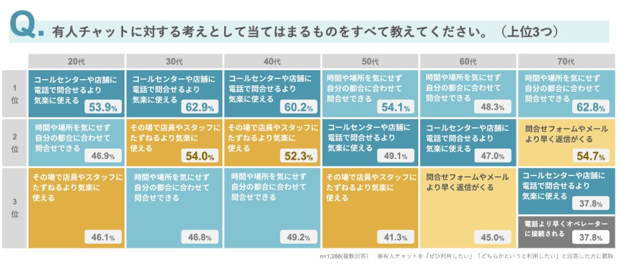 チャットボットに比べ、有人チャットの方が「利用したい」と回答する割合が高く、70代でも有人チャットであれば約3割が「利用したい」と回答。若年層は気軽さや心理的負担の少なさ、中高年層は利便性、高齢層ではさらに問題解決までのスピードを重視し、年代ごとに評価のポイントに違いが見られました。
