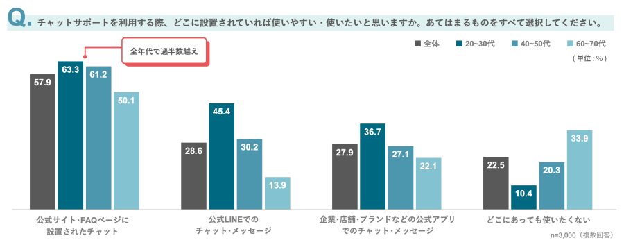 全世代の5割以上が「公式サイト・FAQページ」を設置場所として支持、多様な顧客層を前提としたチャネル設計が重要に